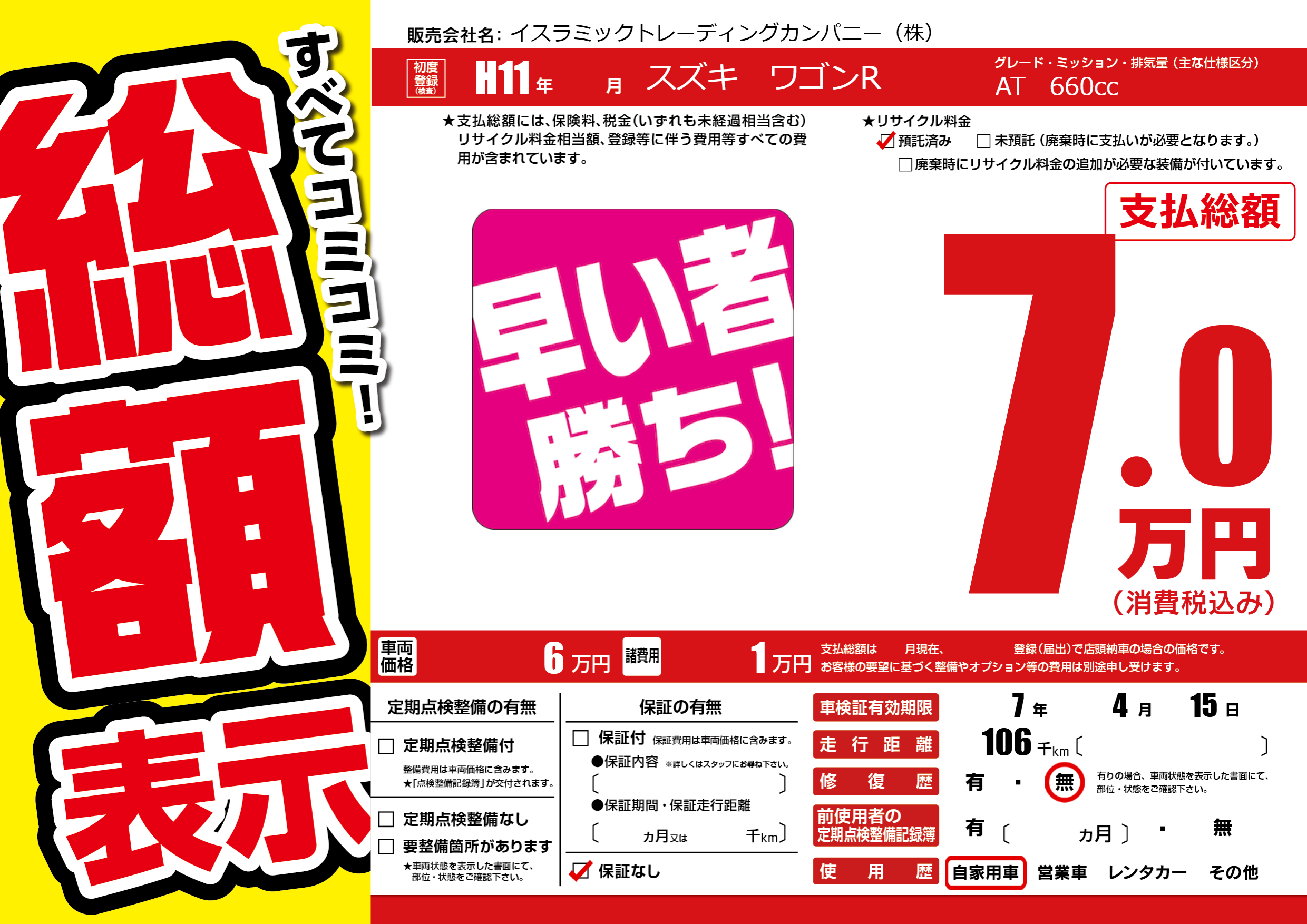 | 車名 | スズキ ワゴンR | グレード ミッション 排気量 |