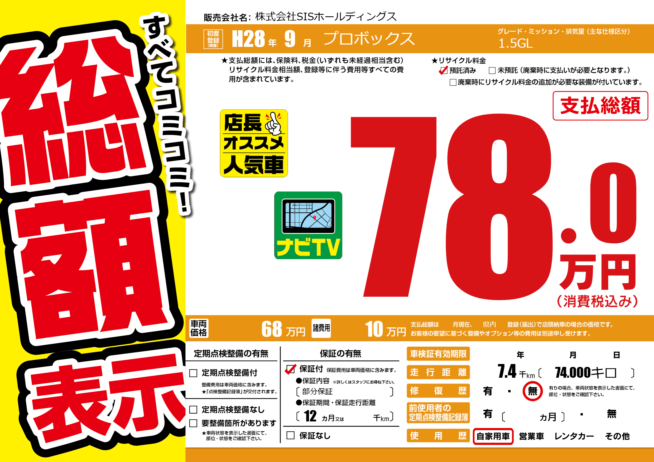 | 車名 | プロボックス | グレード ミッション 排気量 |