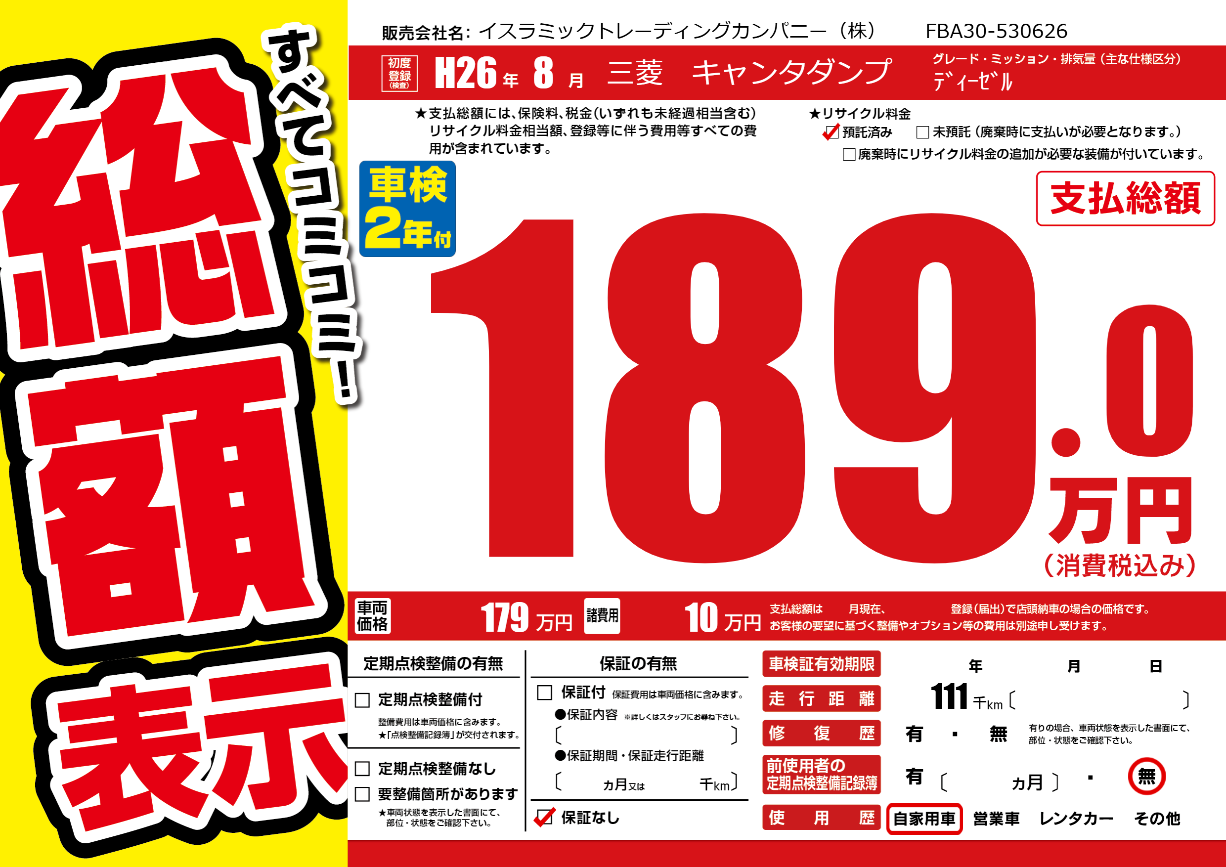 | 走行キロ | 11.1万km | 初年度登録 | H26年8月 |
