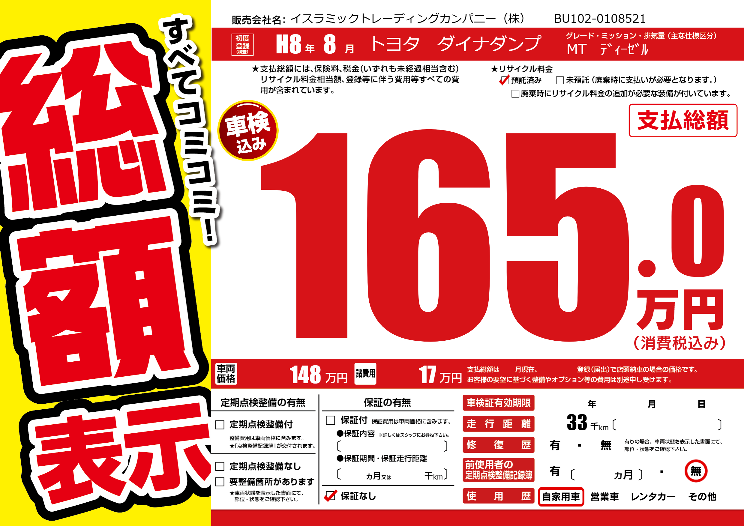 | 走行キロ | 3.3万km | 初年度登録 | H8年8月 |