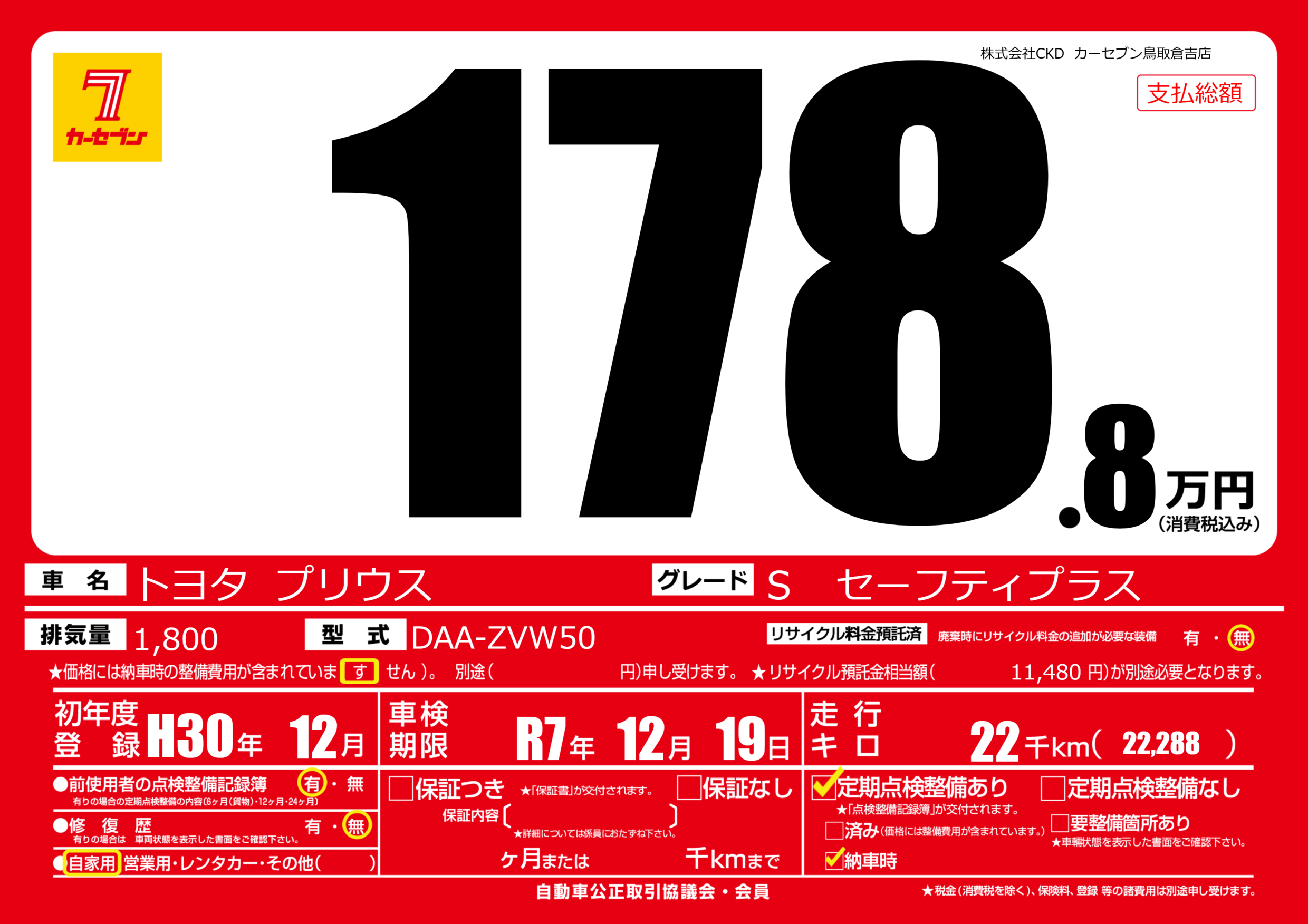| 車名 | トヨタ プリウス | グレード ミッション 排気量 |