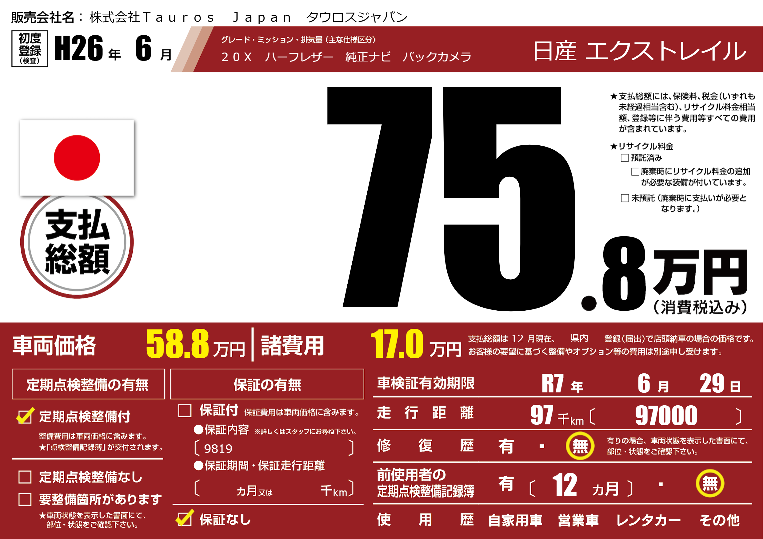 | 車名 | 日産 エクストレイル | グレード ミッション 排気量 |