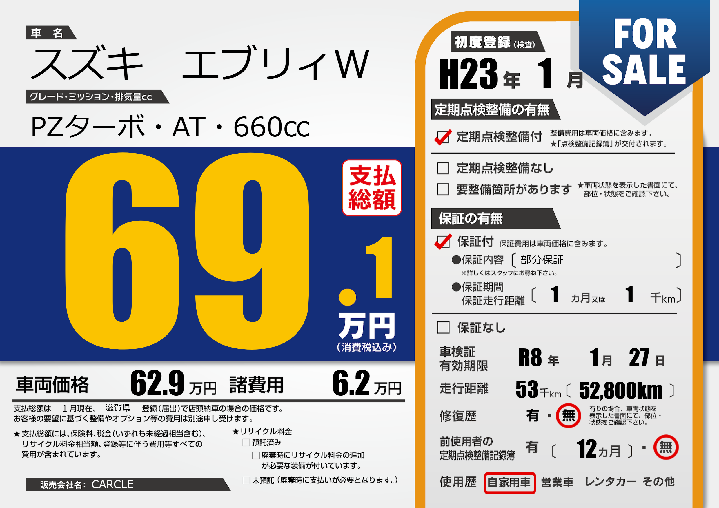 | 車名 | スズキ エブリィW | グレード ミッション 排気量 |