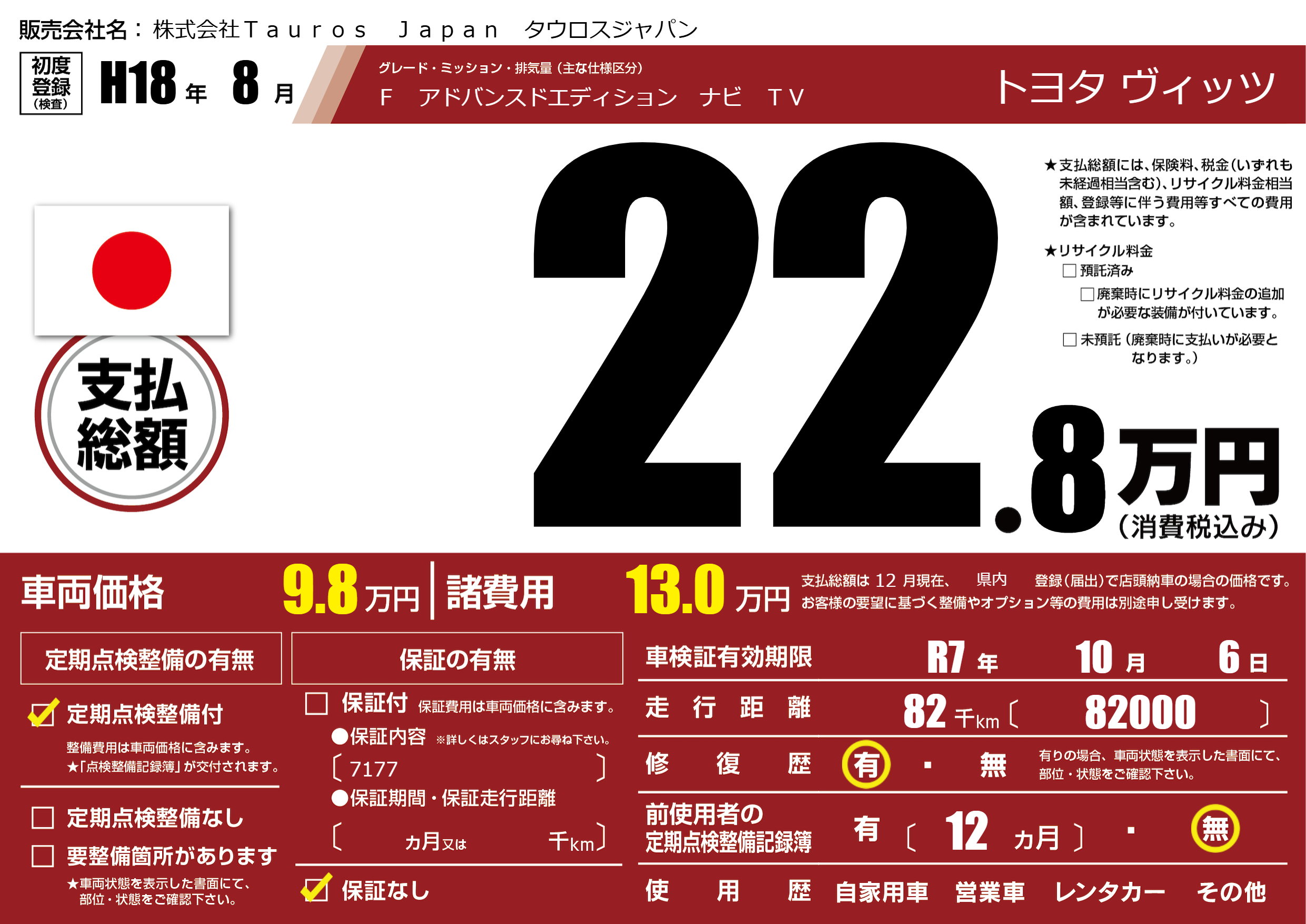 | 走行キロ | 8.2万km | 初年度登録 | H18年8月 |