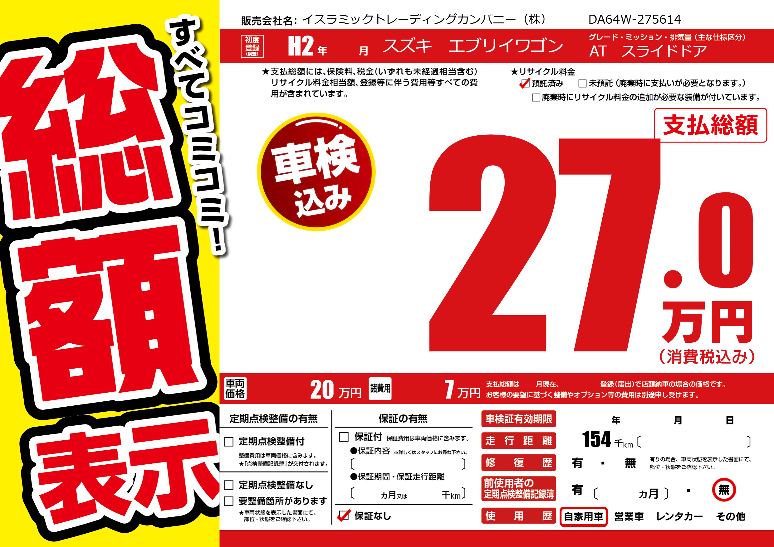 | 車名 | スズキ エブリイワゴン | グレード ミッション 排気量 |