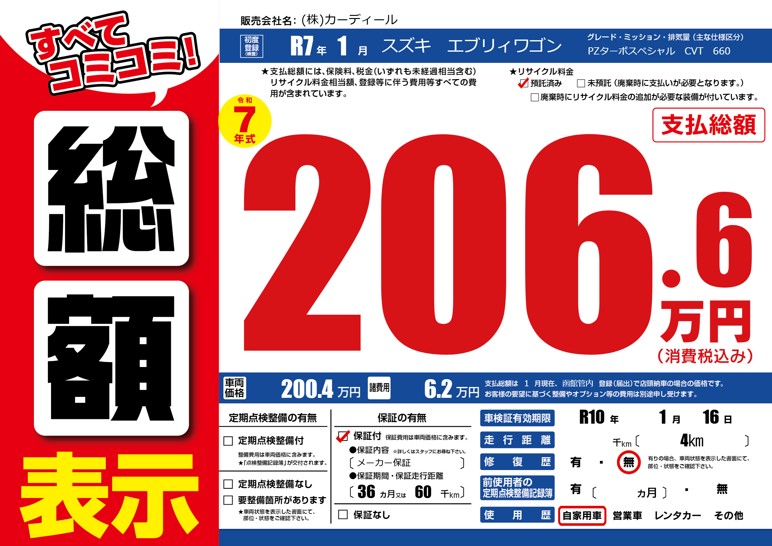 | 車名 | スズキ エブリィワゴン | グレード ミッション 排気量 |
