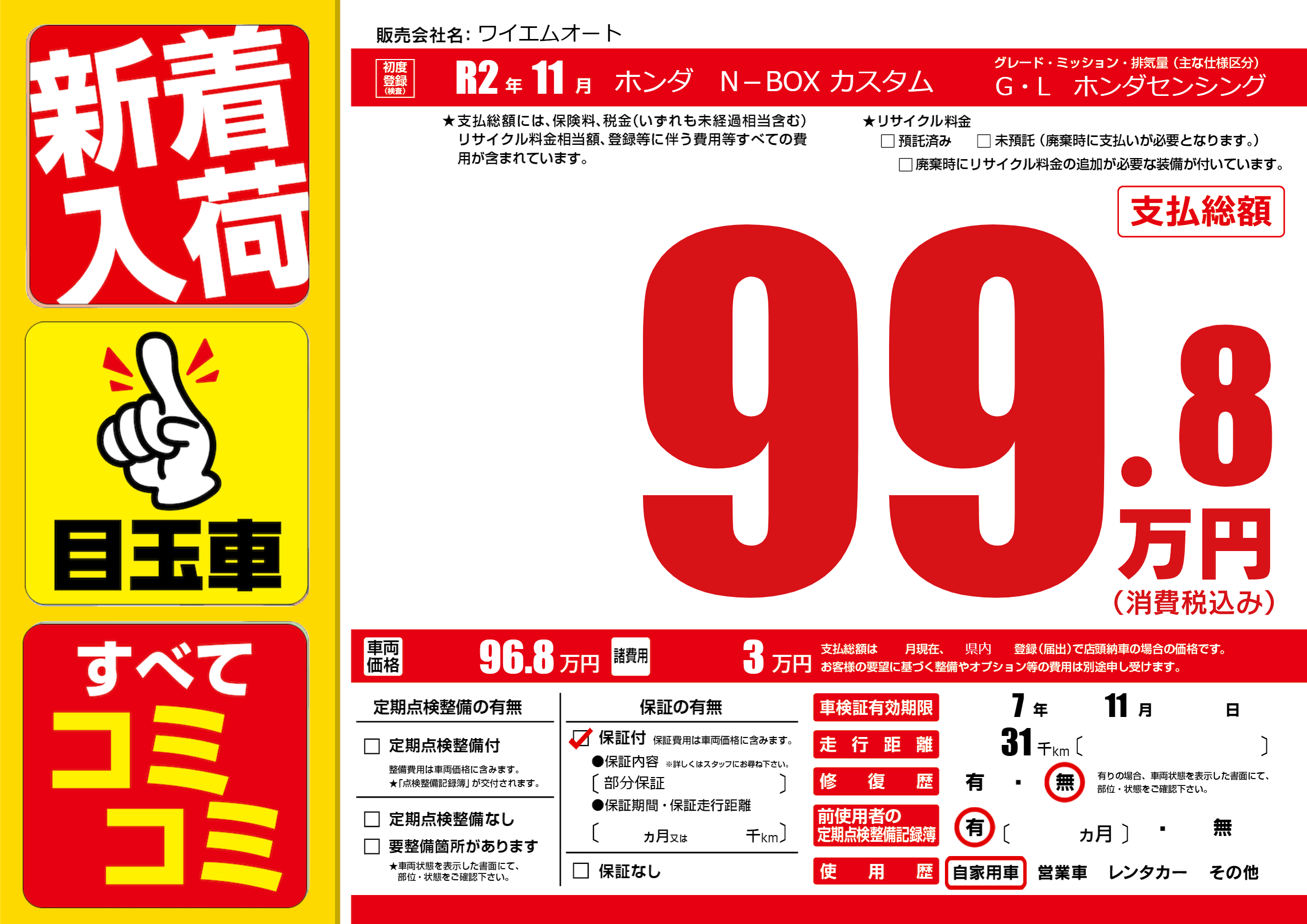 | 車名 | ホンダ N-BOX カスタム | グレード ミッション 排気量 |