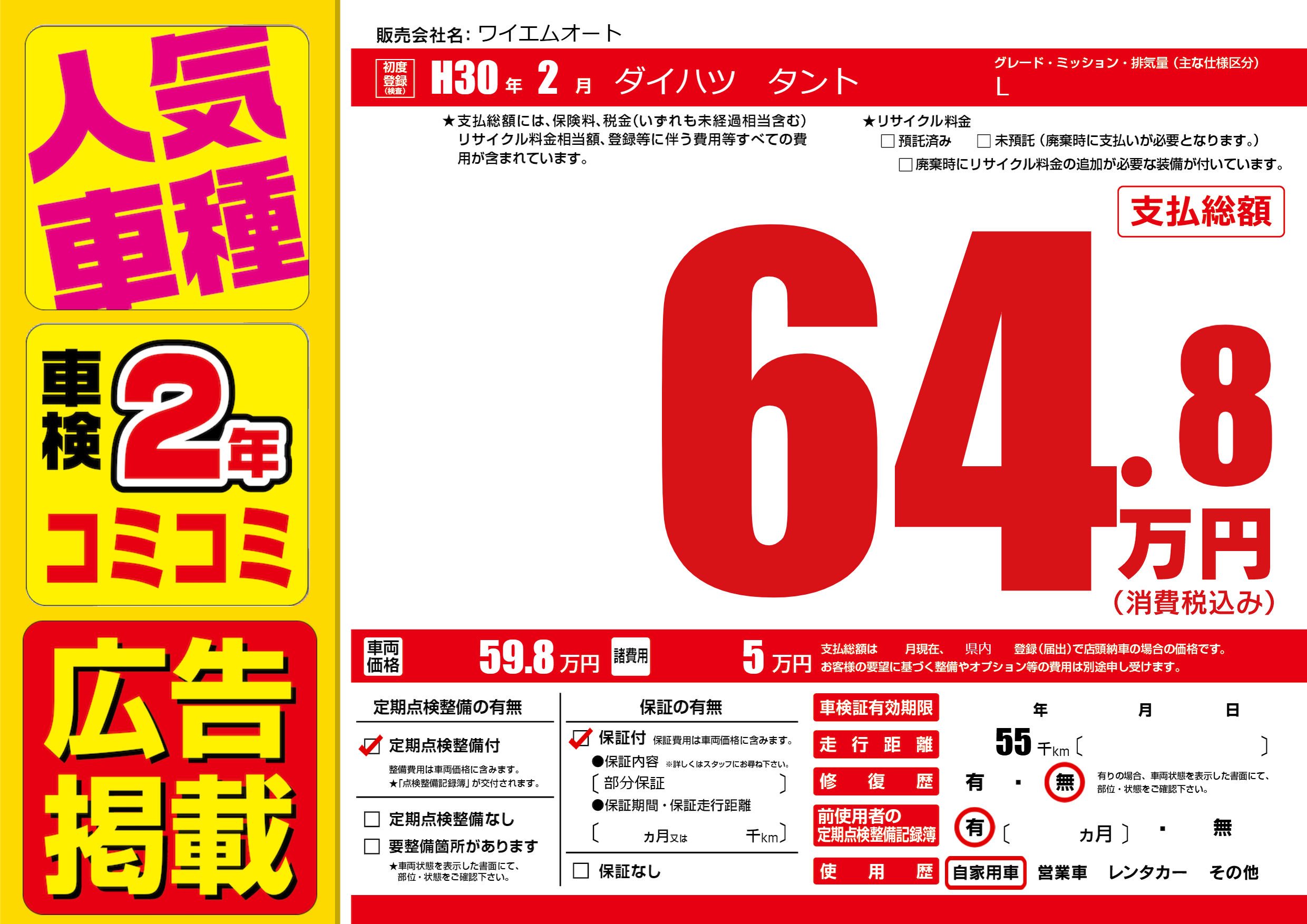 保証付き 保証内容(部分保証) ---ヶ月または()千kmまで |