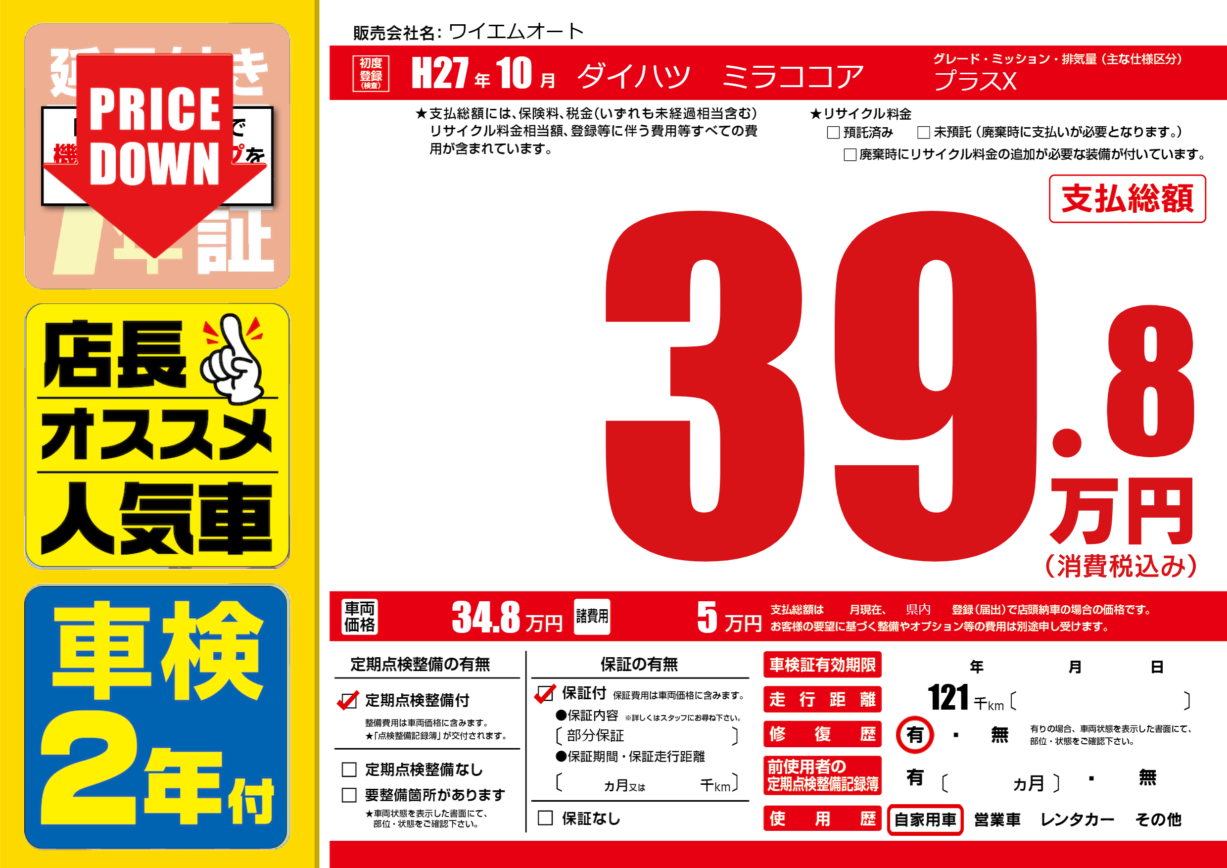 | 車名 | ダイハツ ミラココア | グレード ミッション 排気量 |