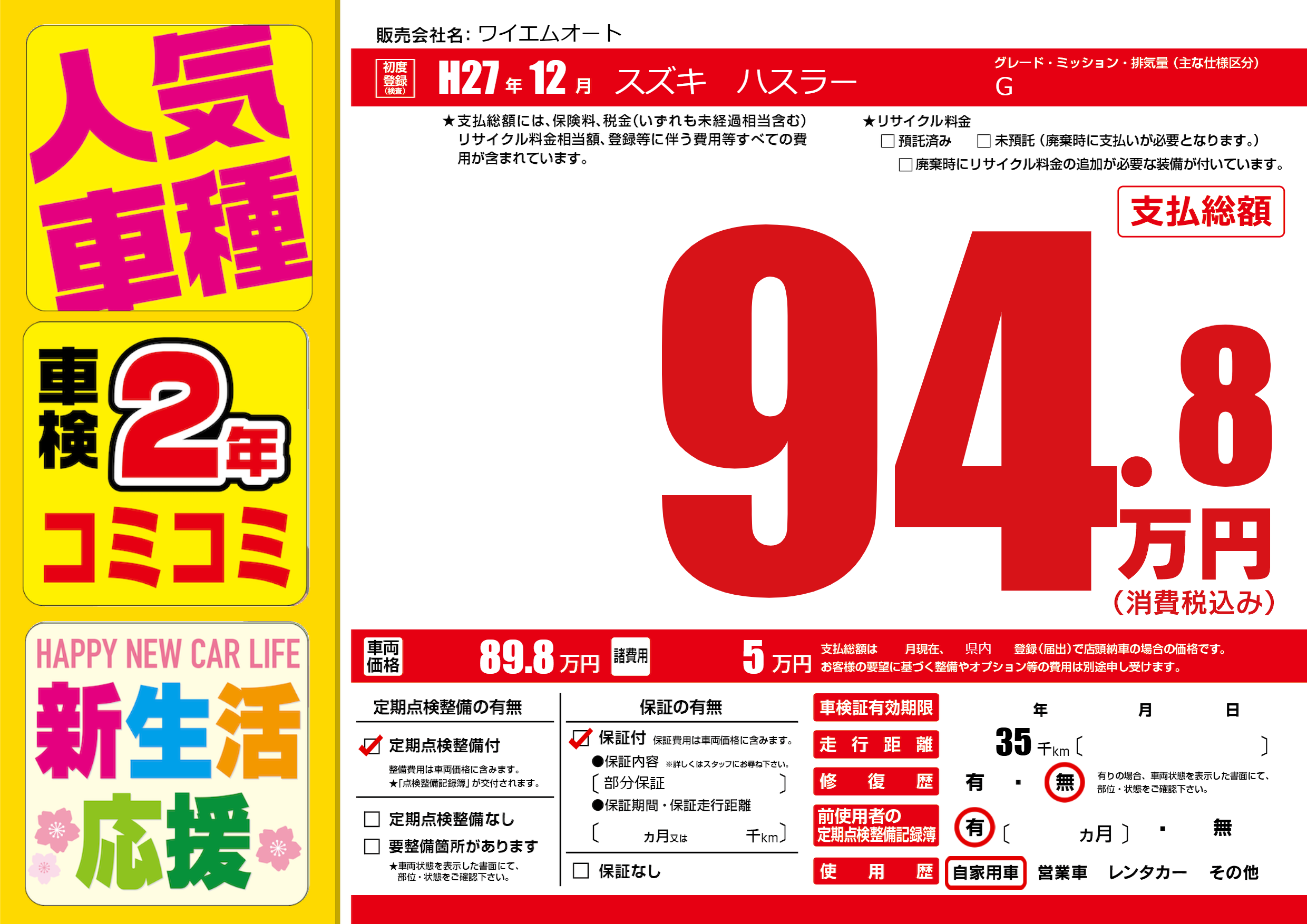 | 車名 | スズキ ハスラー | グレード ミッション 排気量 |