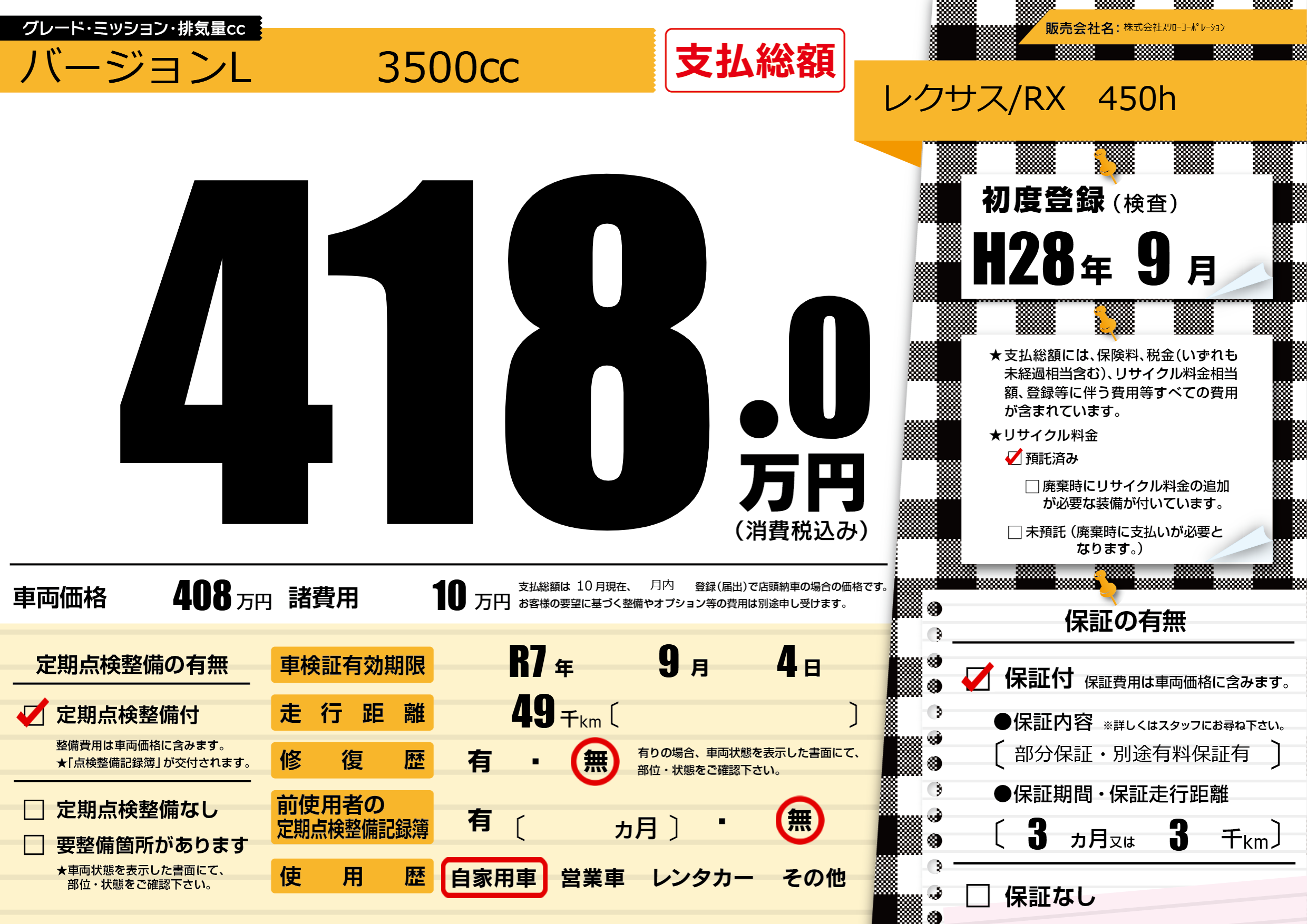| 車名 | レクサス/RX 450h | グレード ミッション 排気量 |