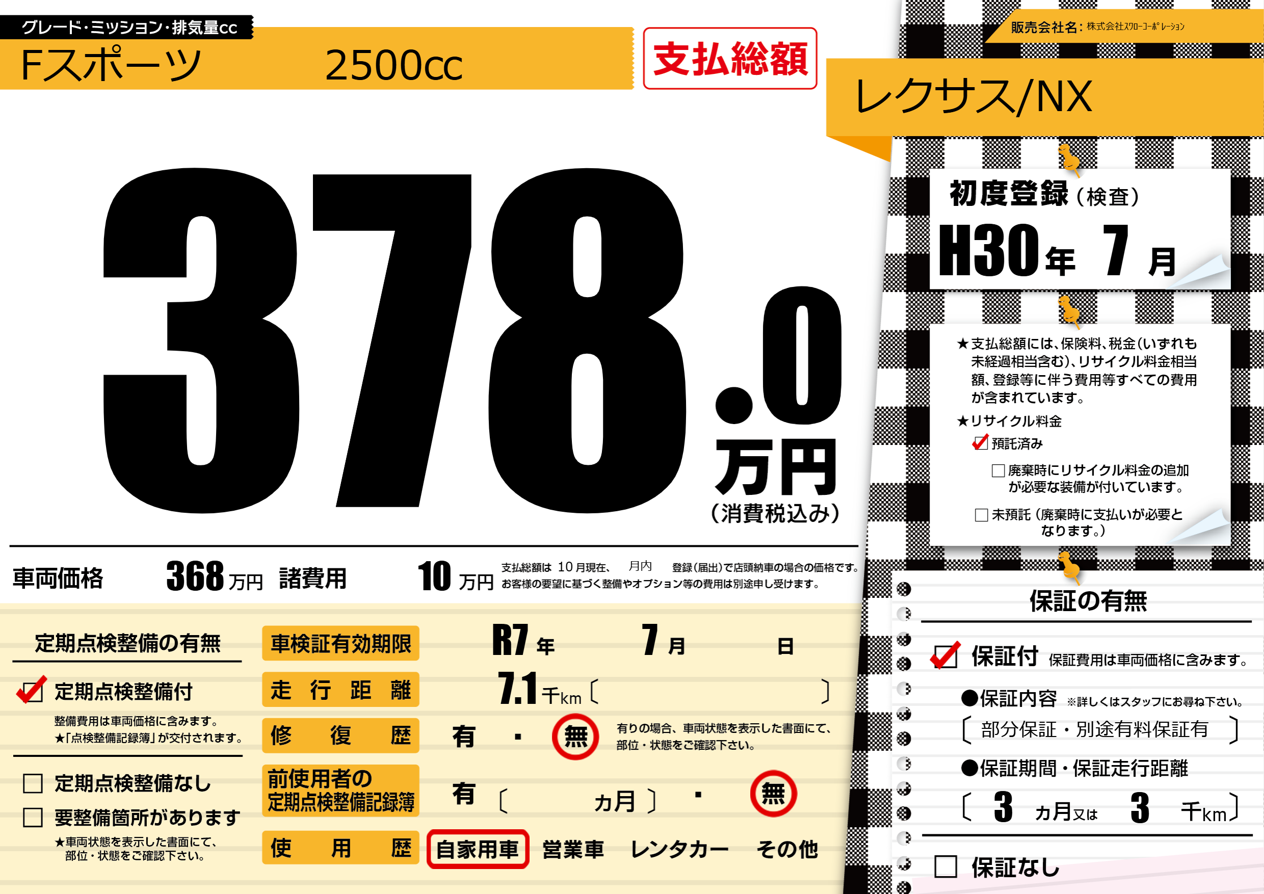 | 車名 | レクサス/NX | グレード ミッション 排気量 |