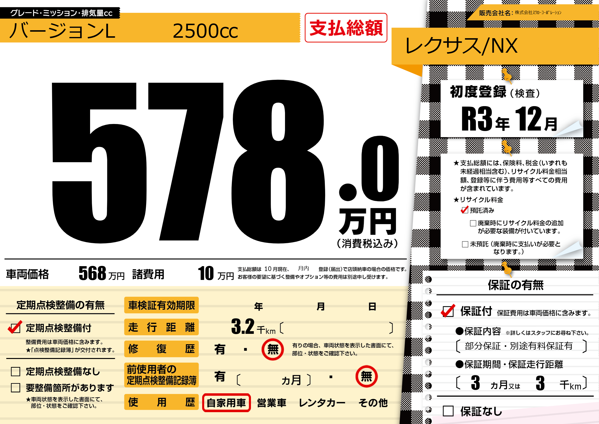 保証付き 保証内容(部分保証・別途有料保証有) 3ヶ月または(3)千kmまで |