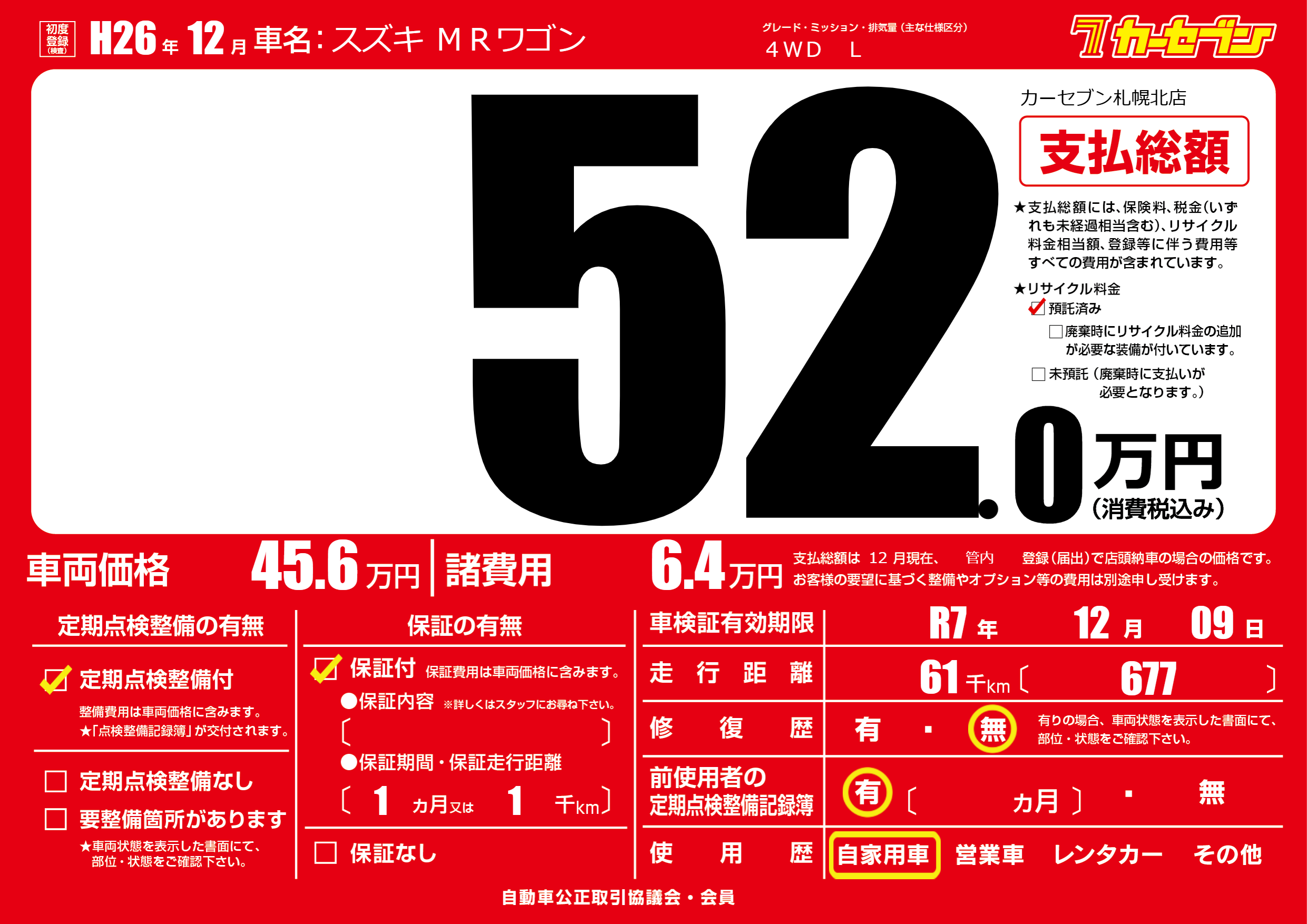 | 車検制限 | R7年 12月 09日 | ||