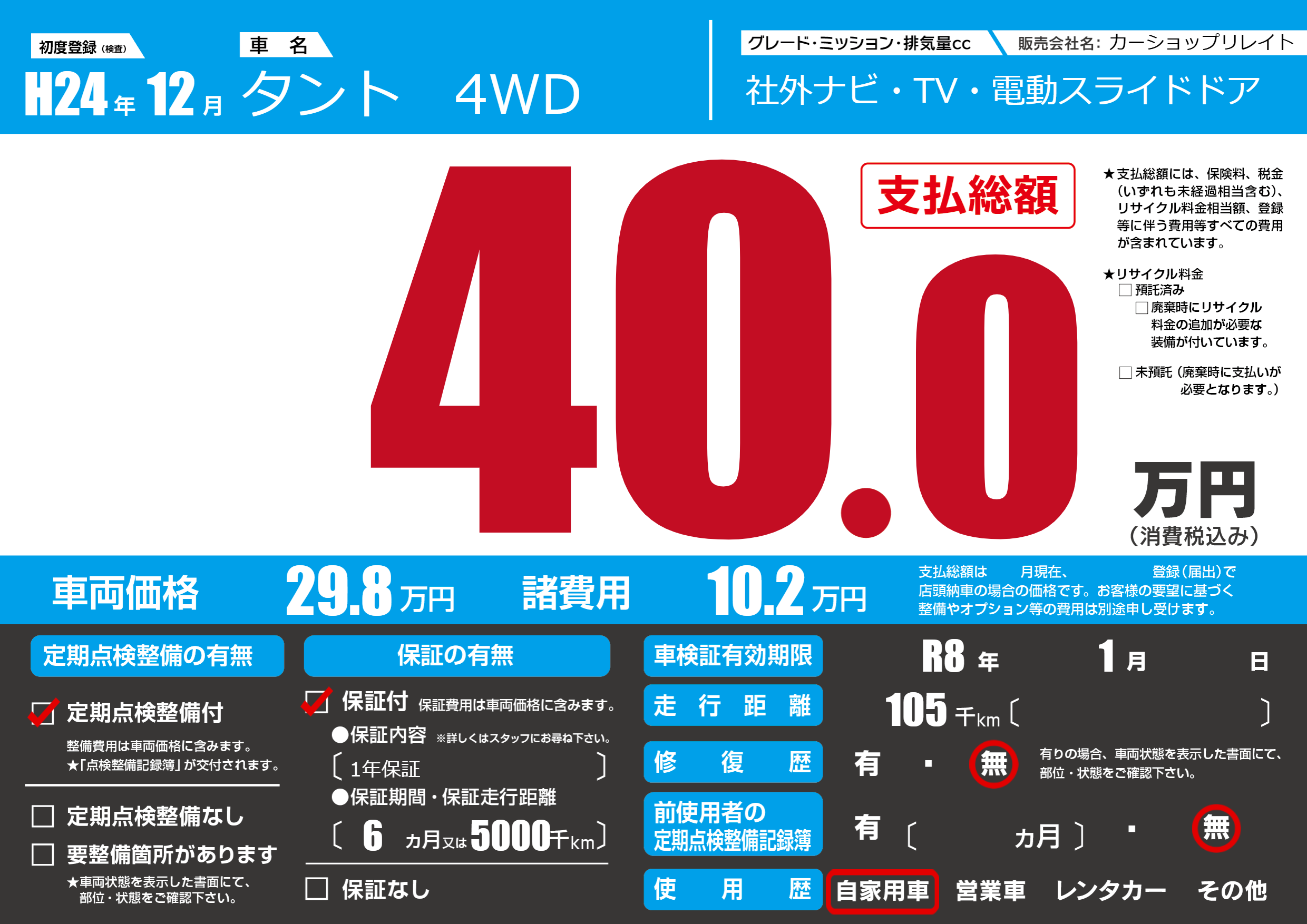 | 車検制限 | R8年 1月 - 日 | ||