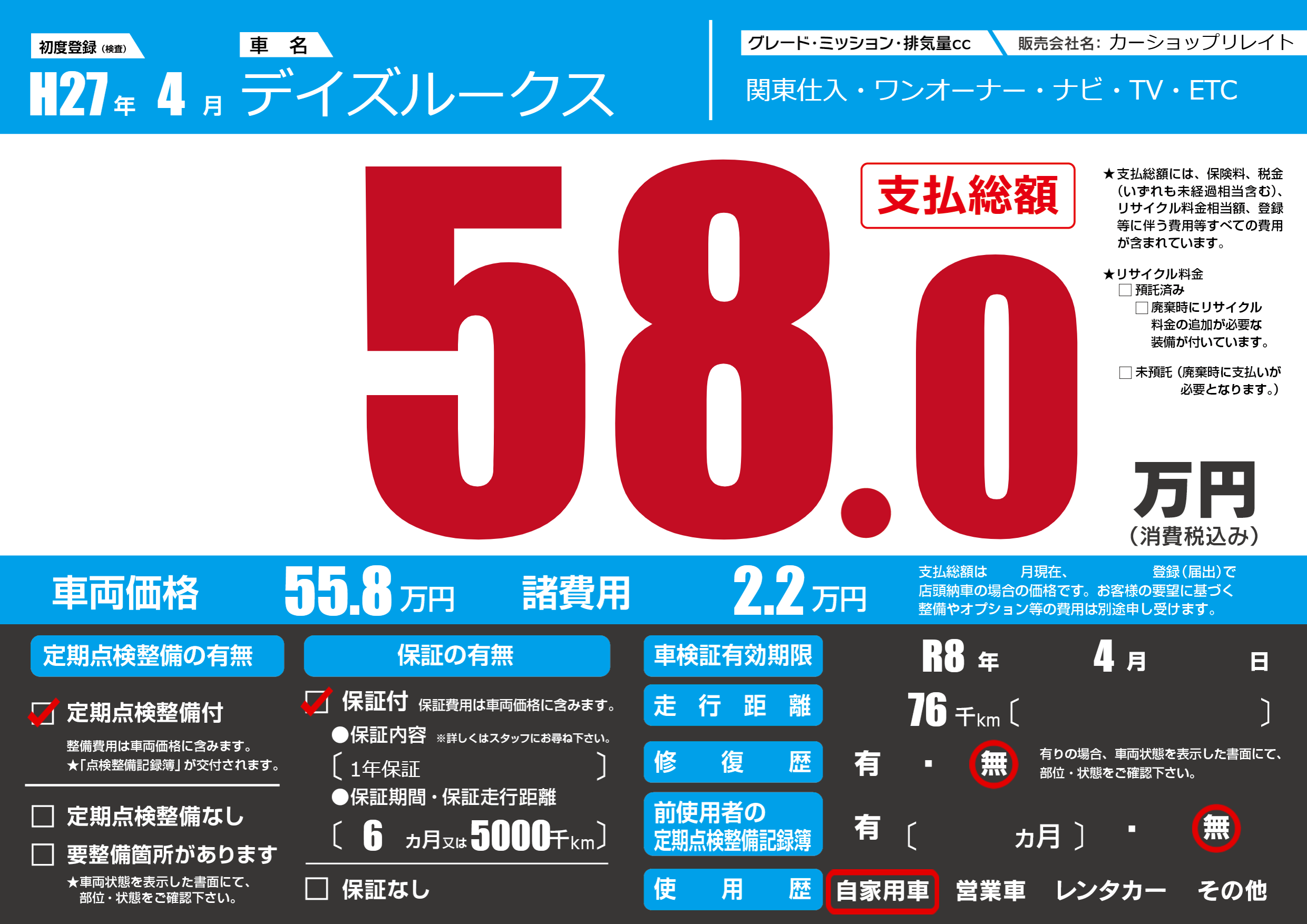 | 走行キロ | 7.6万km | 初年度登録 | H27年4月 |