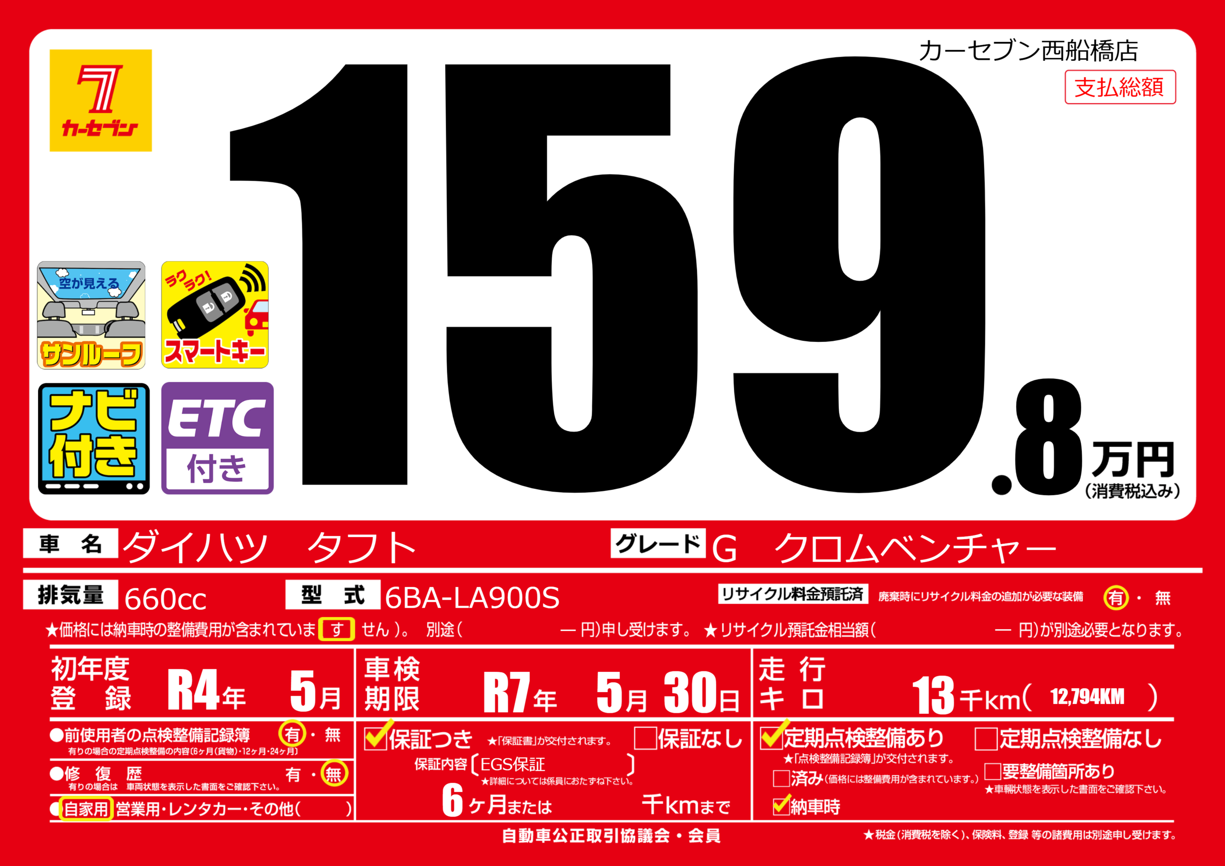 | 走行キロ | 1.3万km | 初年度登録 | R4年5月 |