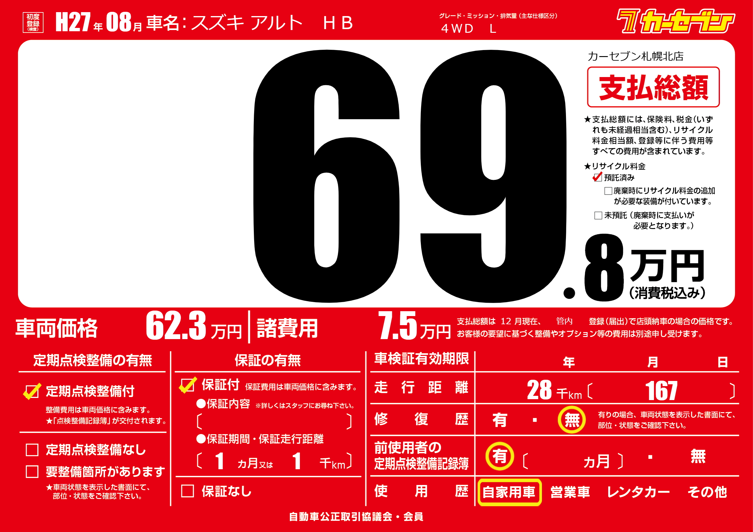 | 車名 | スズキ アルト HB | グレード ミッション 排気量 |