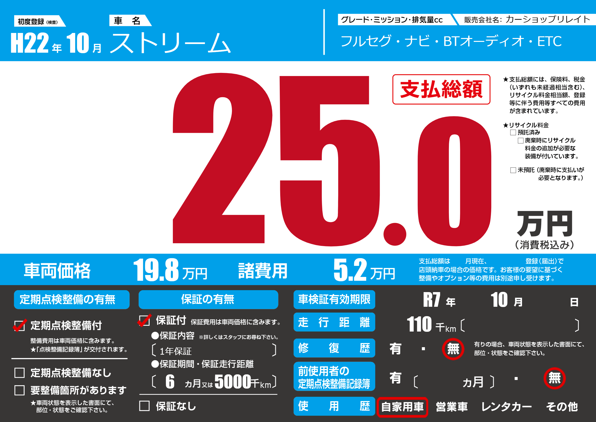 | 走行キロ | 11万km | 初年度登録 | H22年10月 |