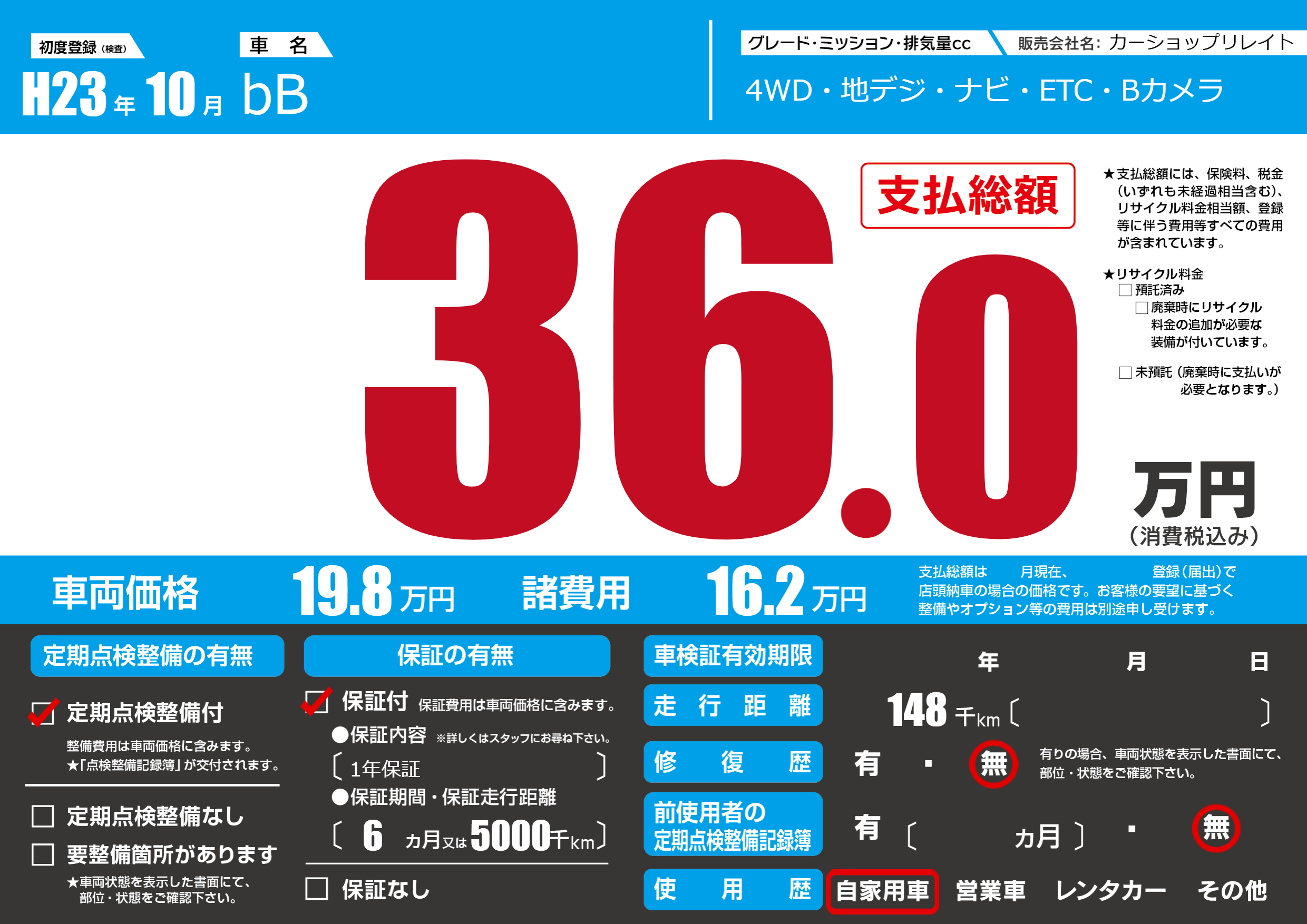 | 走行キロ | 14.8万km | 初年度登録 | H23年10月 |