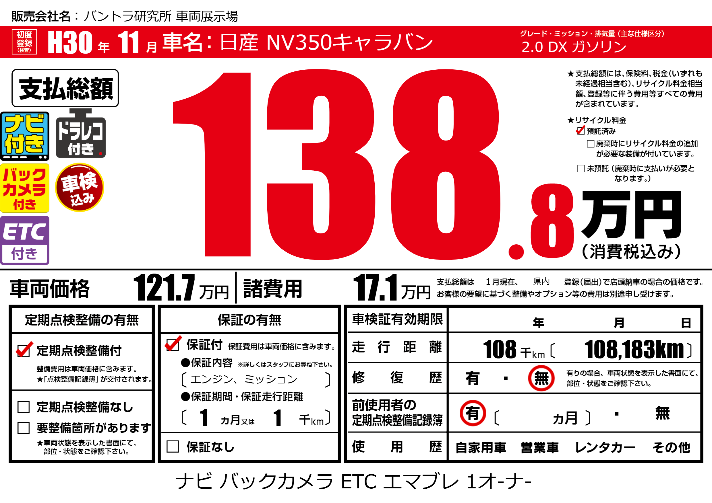 | 走行キロ | 10.8万km | 初年度登録 | H30年11月 |