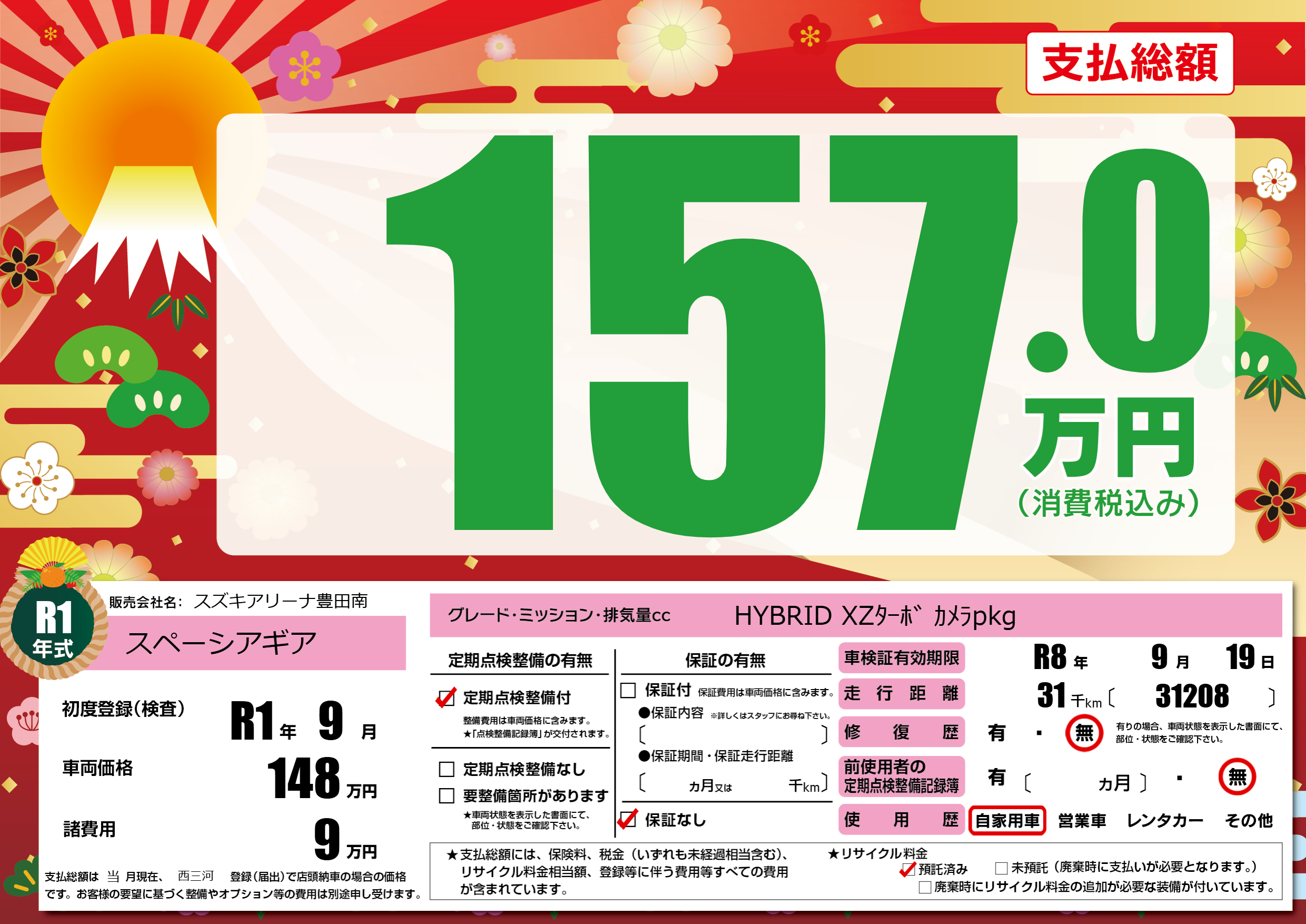 | 走行キロ | 3.1万km | 初年度登録 | R1年9月 |