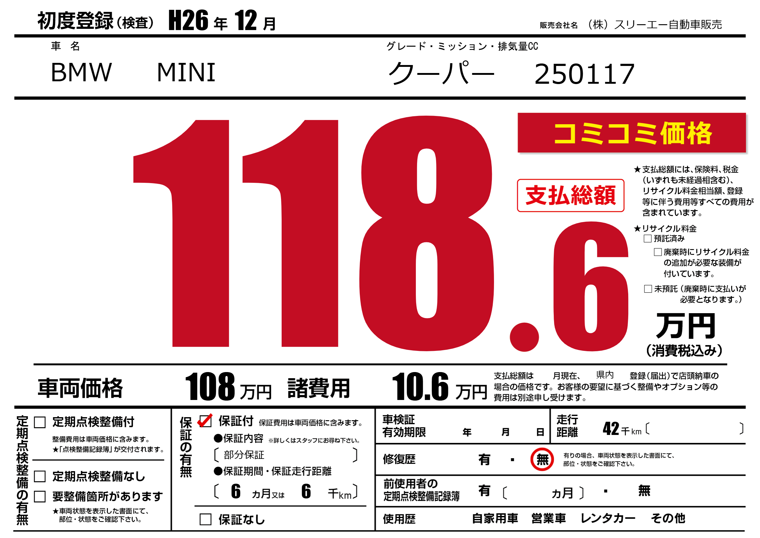 保証付き 保証内容(部分保証) 6ヶ月または(6)千kmまで |