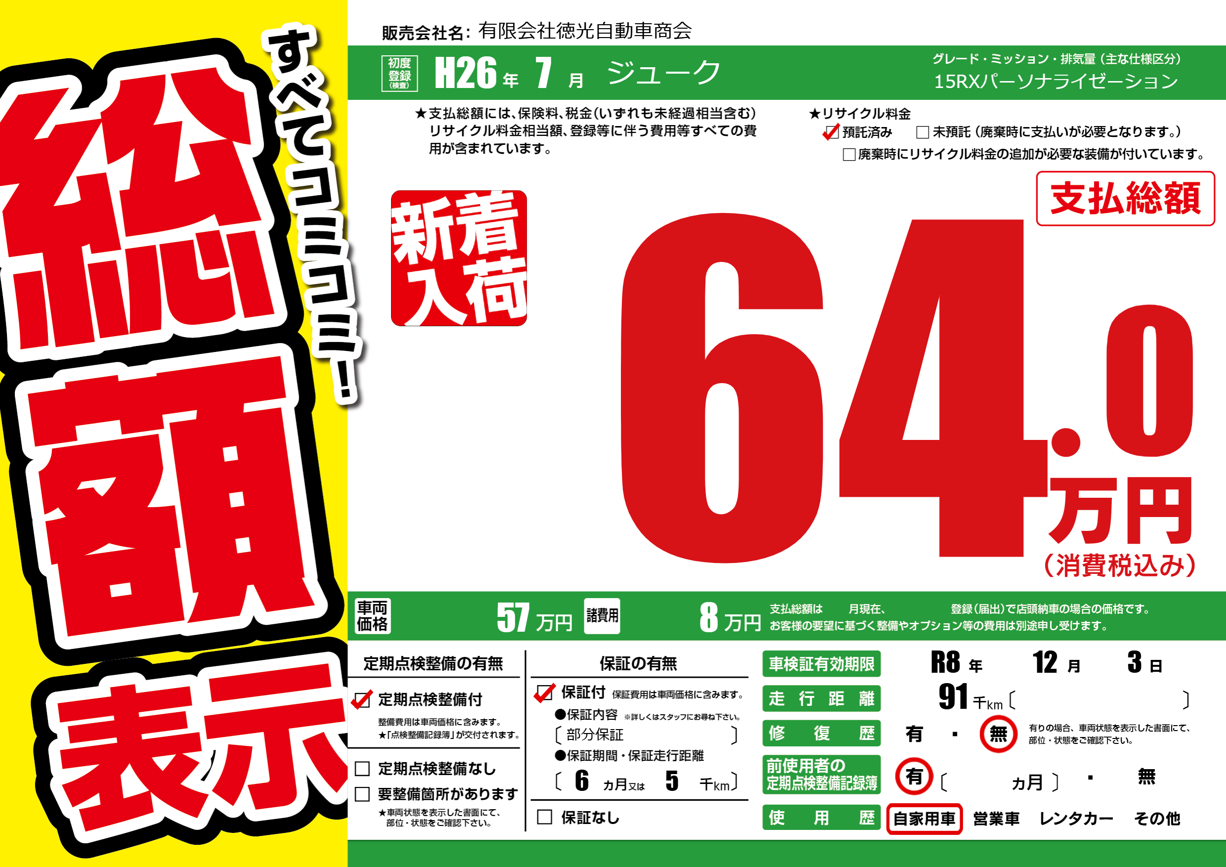 | 車名 | ジューク | グレード ミッション 排気量 |