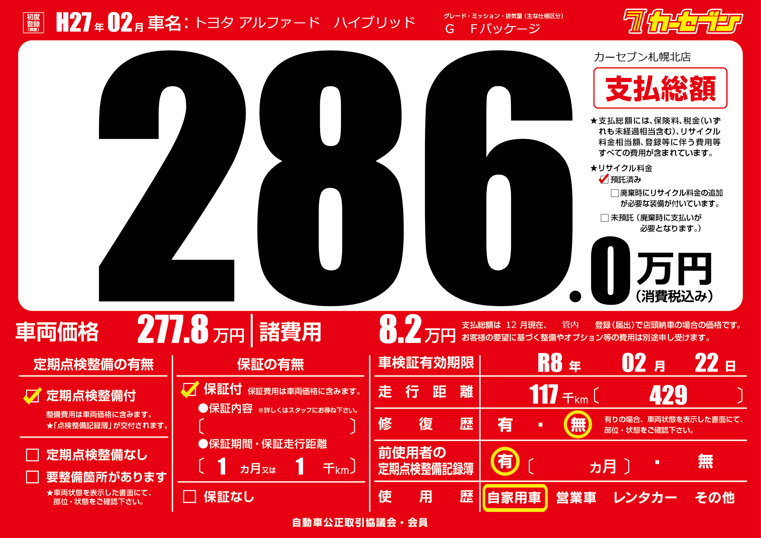 | 車名 | トヨタ アルファード ハイブリッド | グレード ミッション 排気量 |