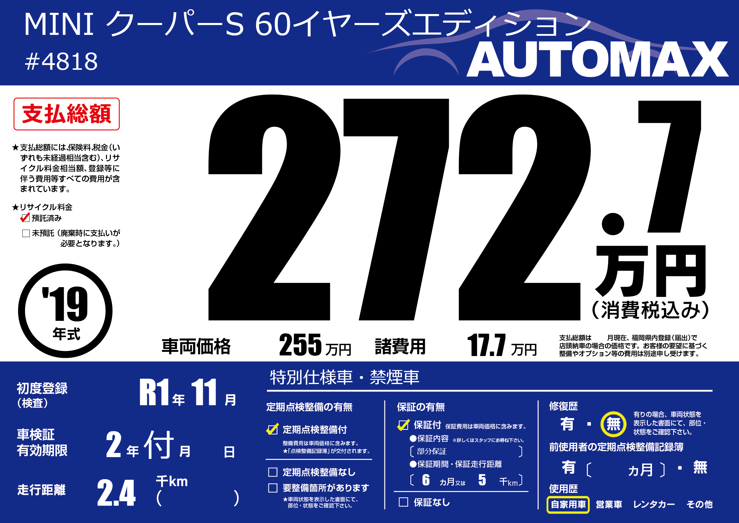 | 車名 | MINI クーパーS 60イヤーズエディション | グレード ミッション 排気量 |