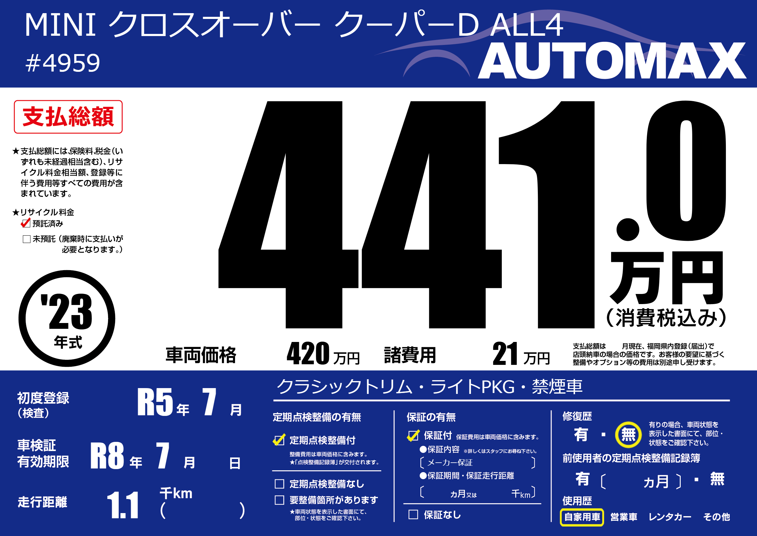 | 車名 | MINI クロスオーバー クーパーD ALL4 | グレード ミッション 排気量 |