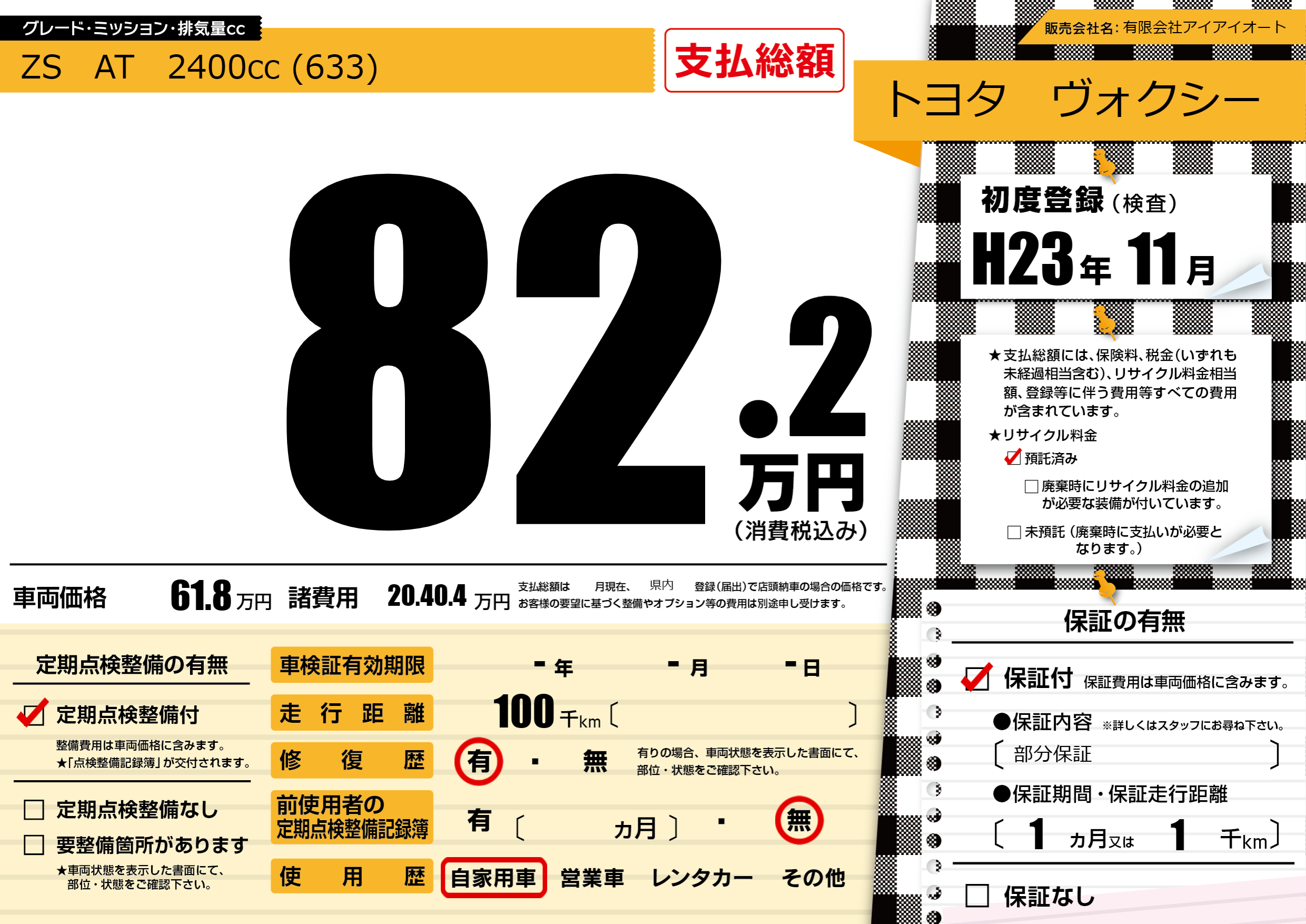 | 車名 | トヨタ ヴォクシー | グレード ミッション 排気量 |