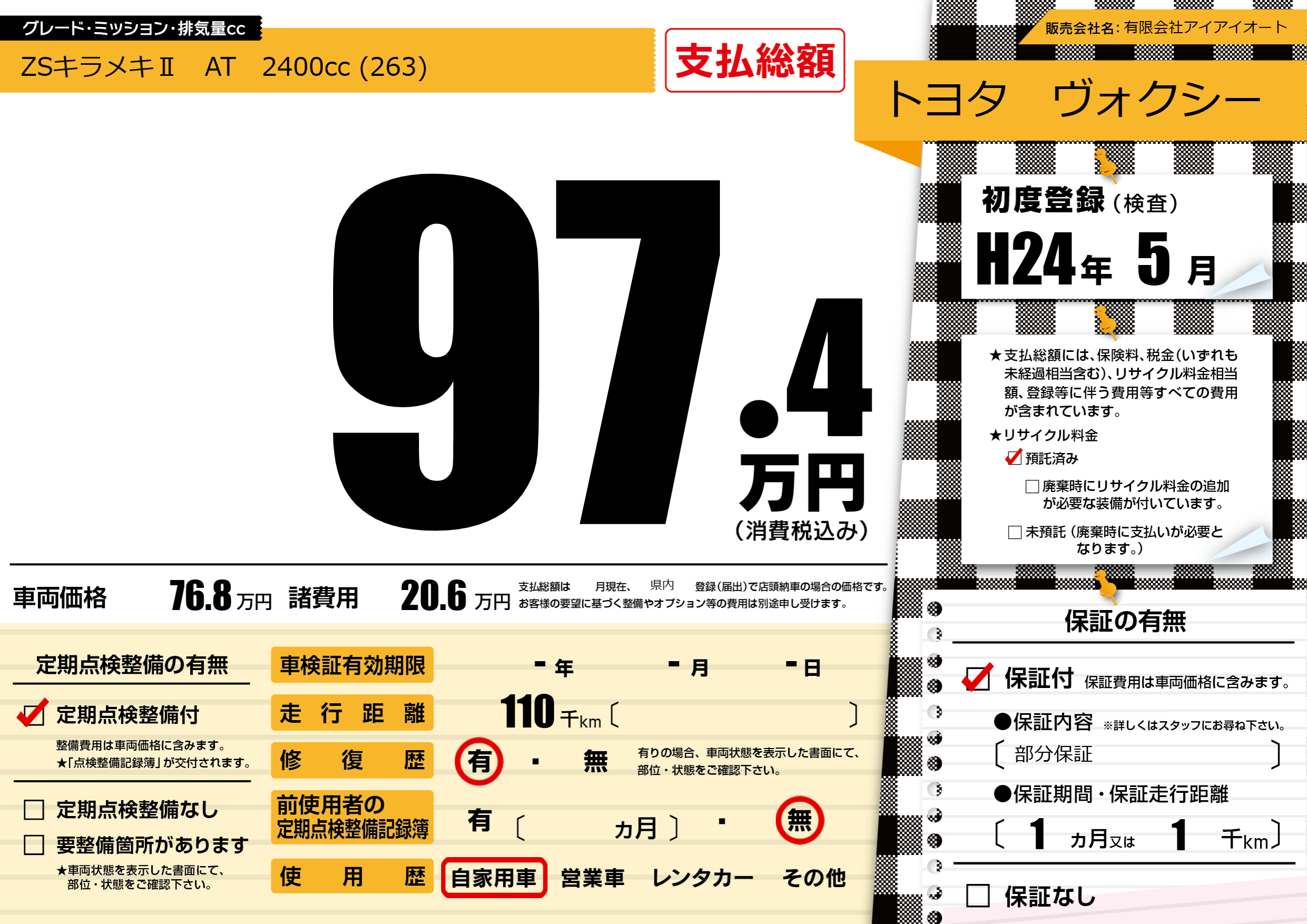 | 走行キロ | 11万km | 初年度登録 | H24年5月 |