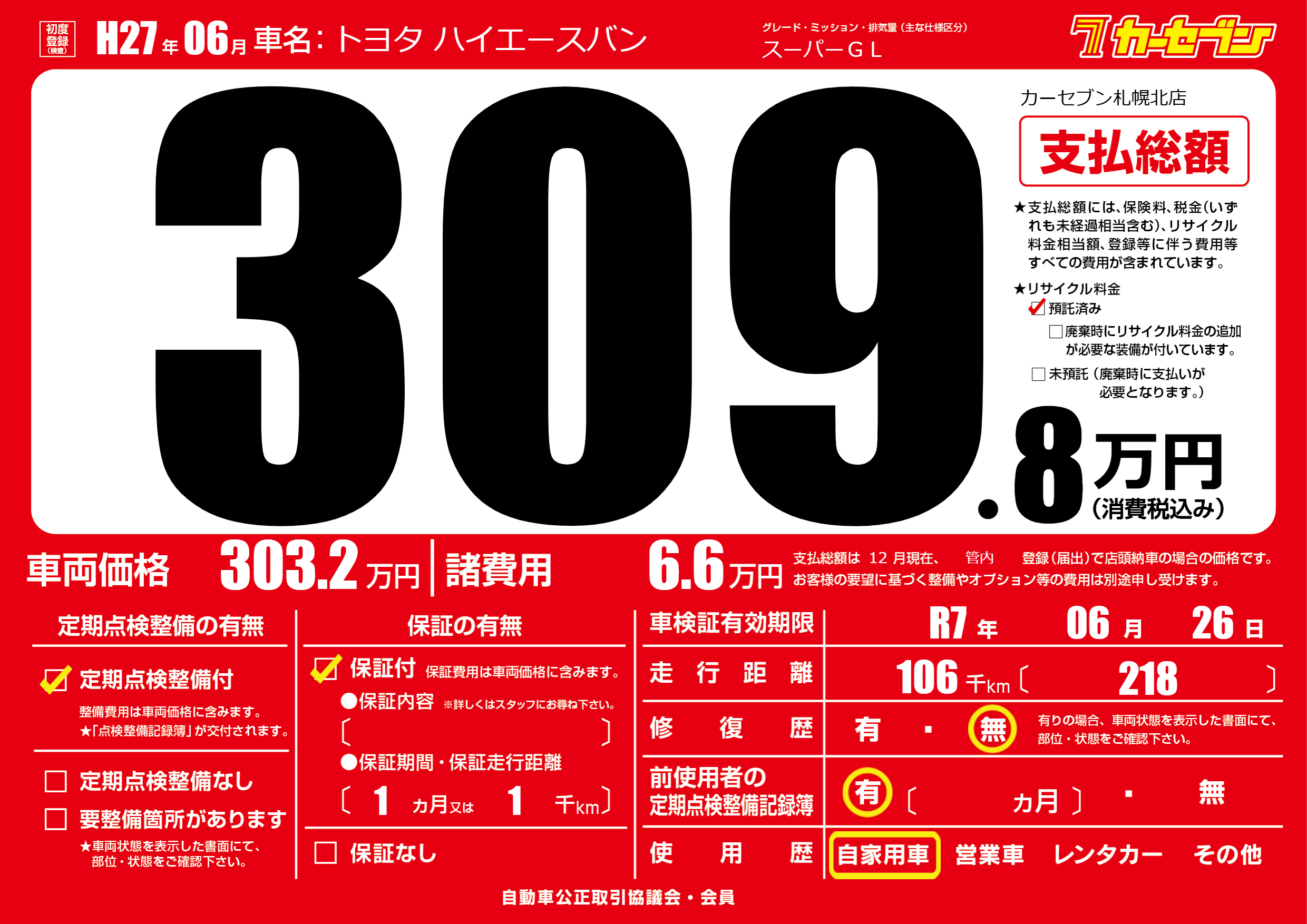 | 走行キロ | 10.6万km | 初年度登録 | H27年06月 |