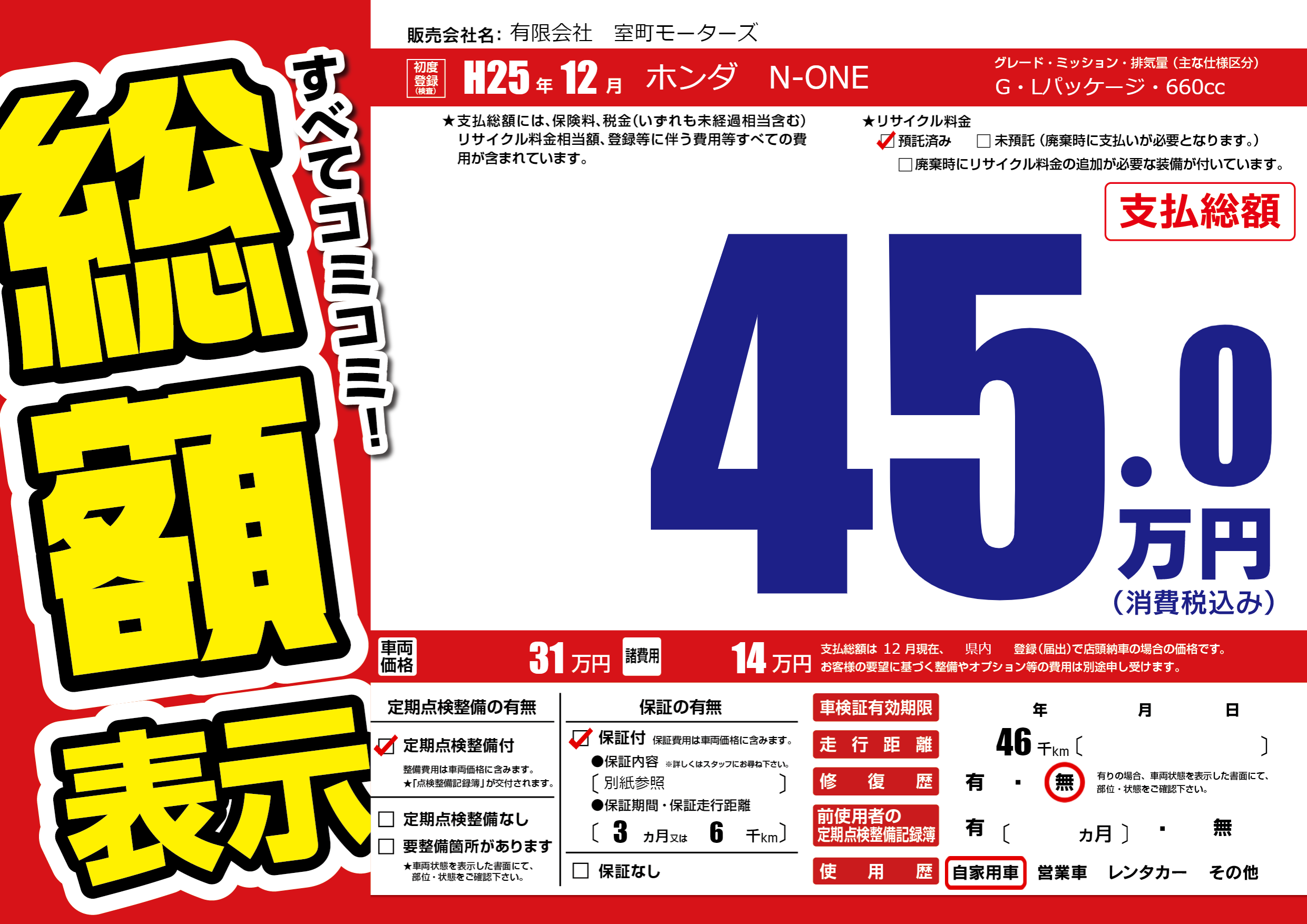 | 車名 | ホンダ N-ONE | グレード ミッション 排気量 |