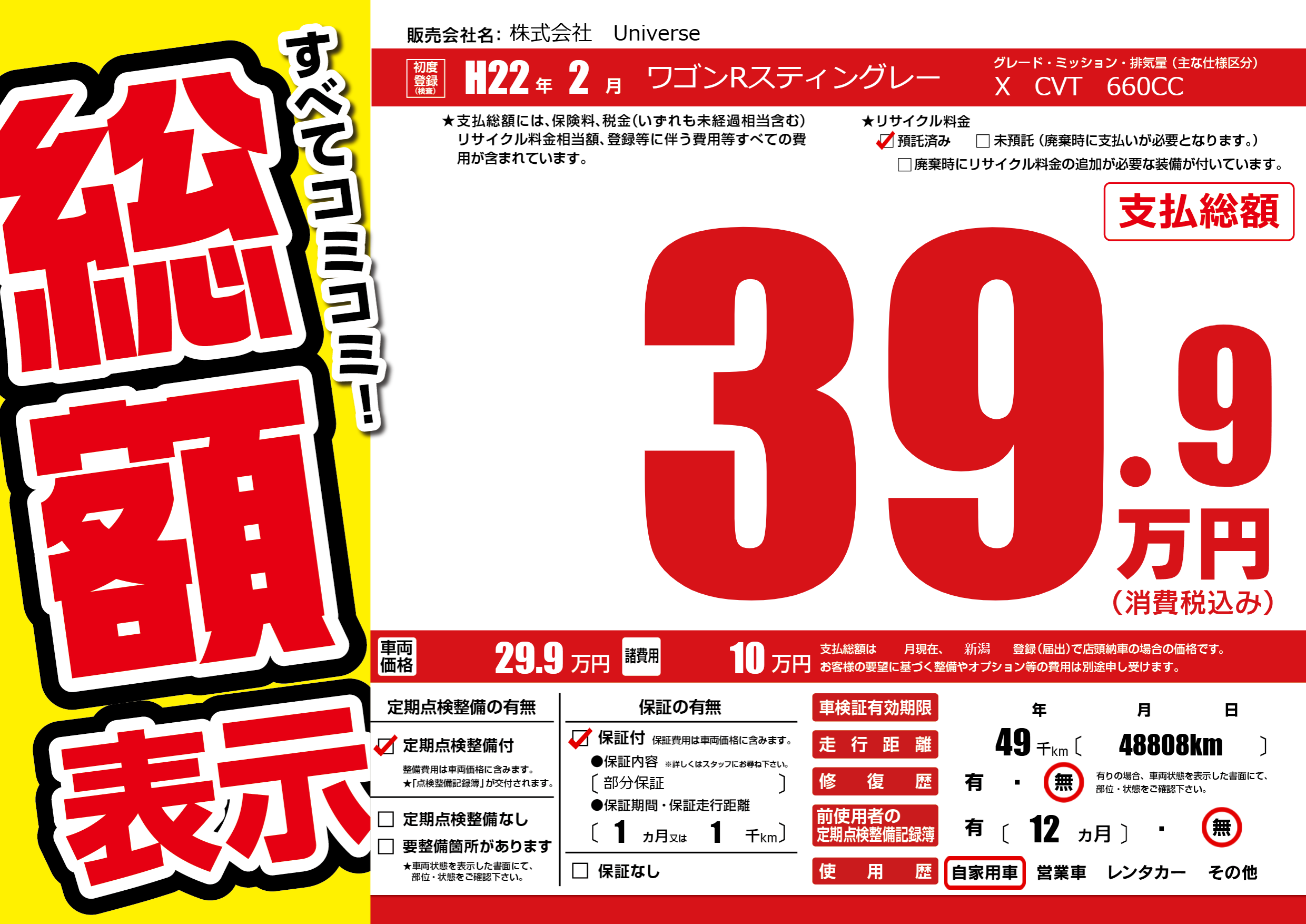 | 走行キロ | 4.9万km | 初年度登録 | H22年2月 |