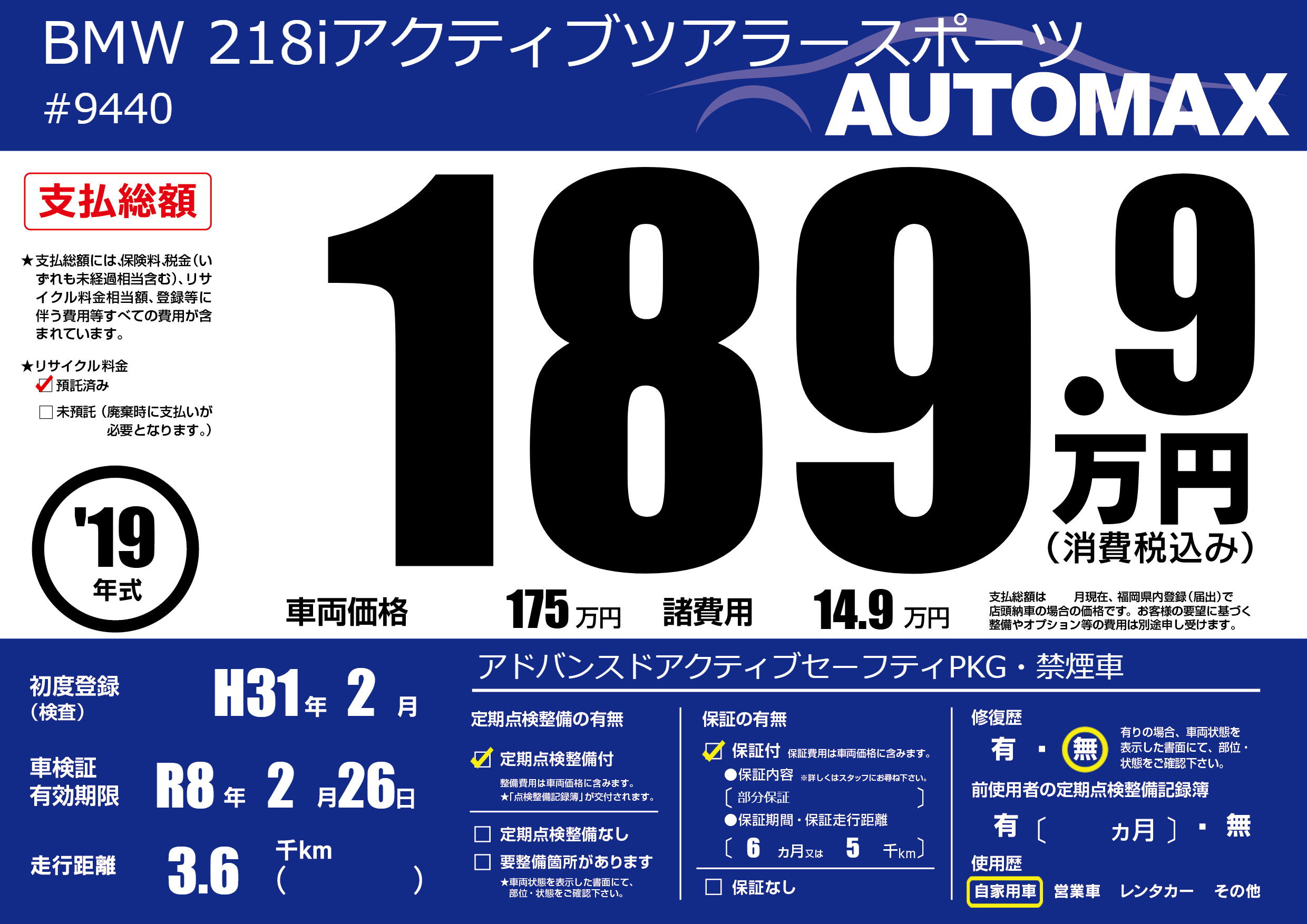| 車名 | BMW 218iアクティブツアラースポーツ | グレード ミッション 排気量 |