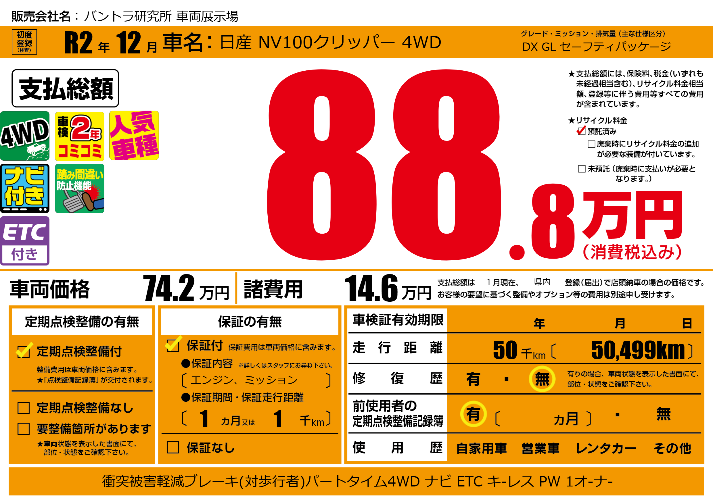 | 車名 | 日産 NV100クリッパー 4WD | グレード ミッション 排気量 |