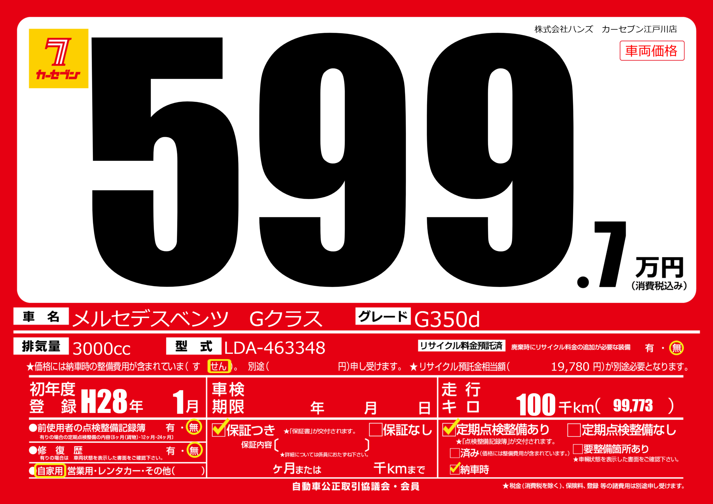 | 車名 | メルセデスベンツ Gクラス | グレード ミッション 排気量 |