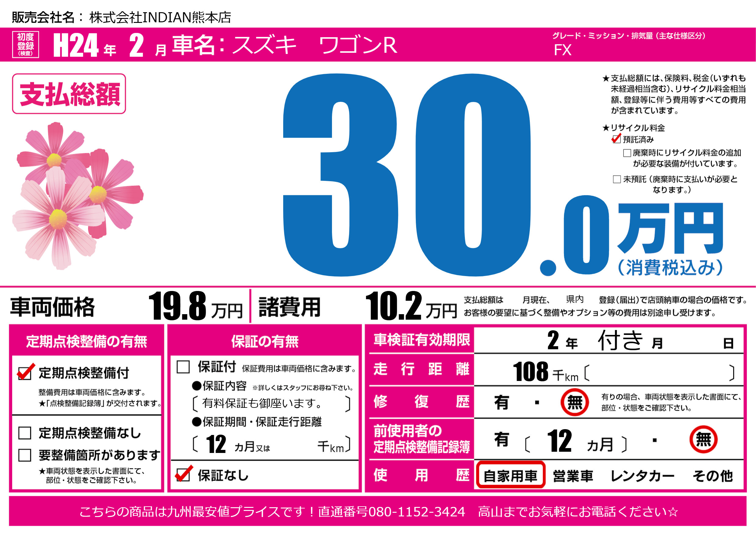 | 走行キロ | 10.8万km | 初年度登録 | H24年2月 |