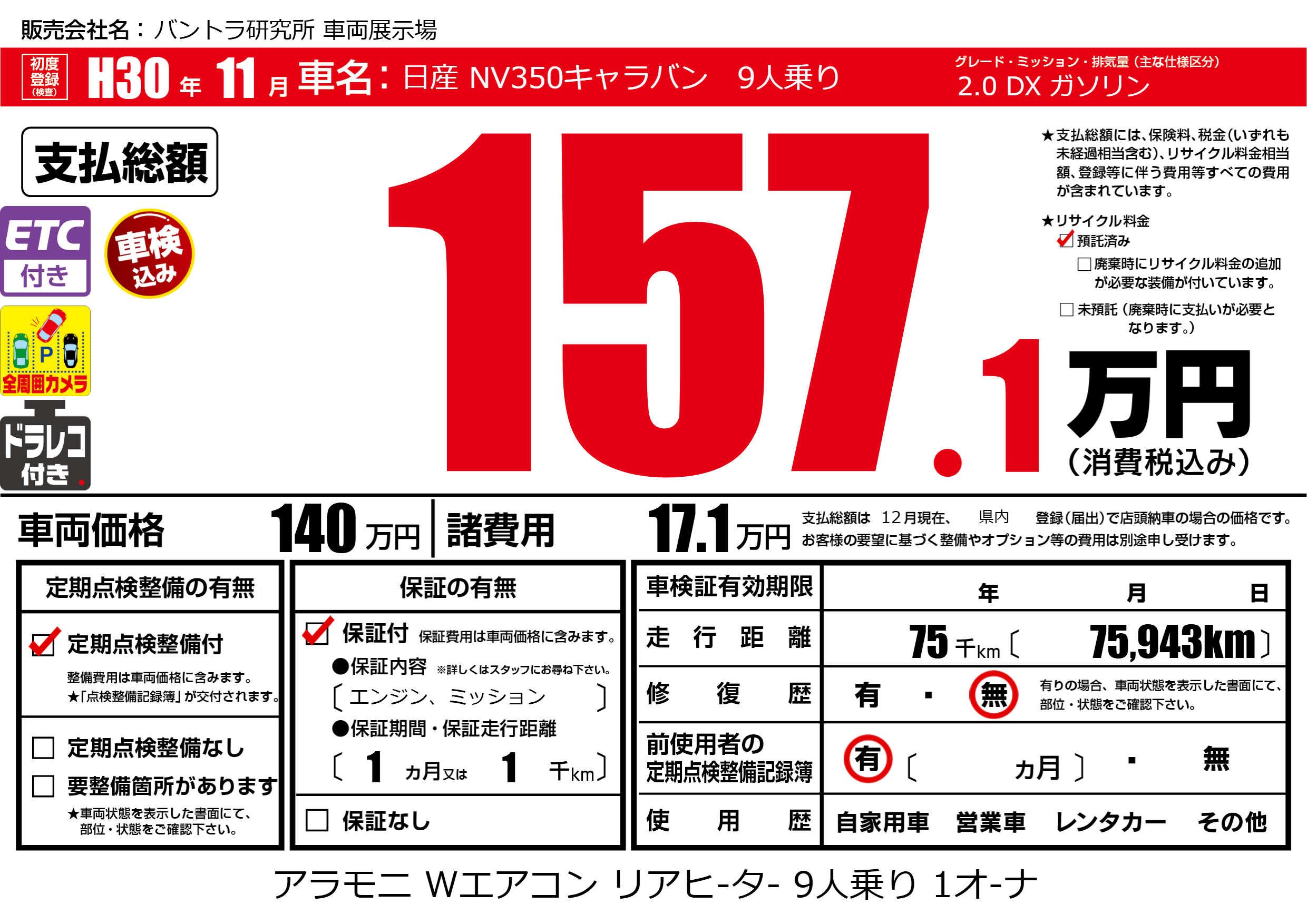 | 車名 | 日産 NV350キャラバン 9人乗り | グレード ミッション 排気量 |