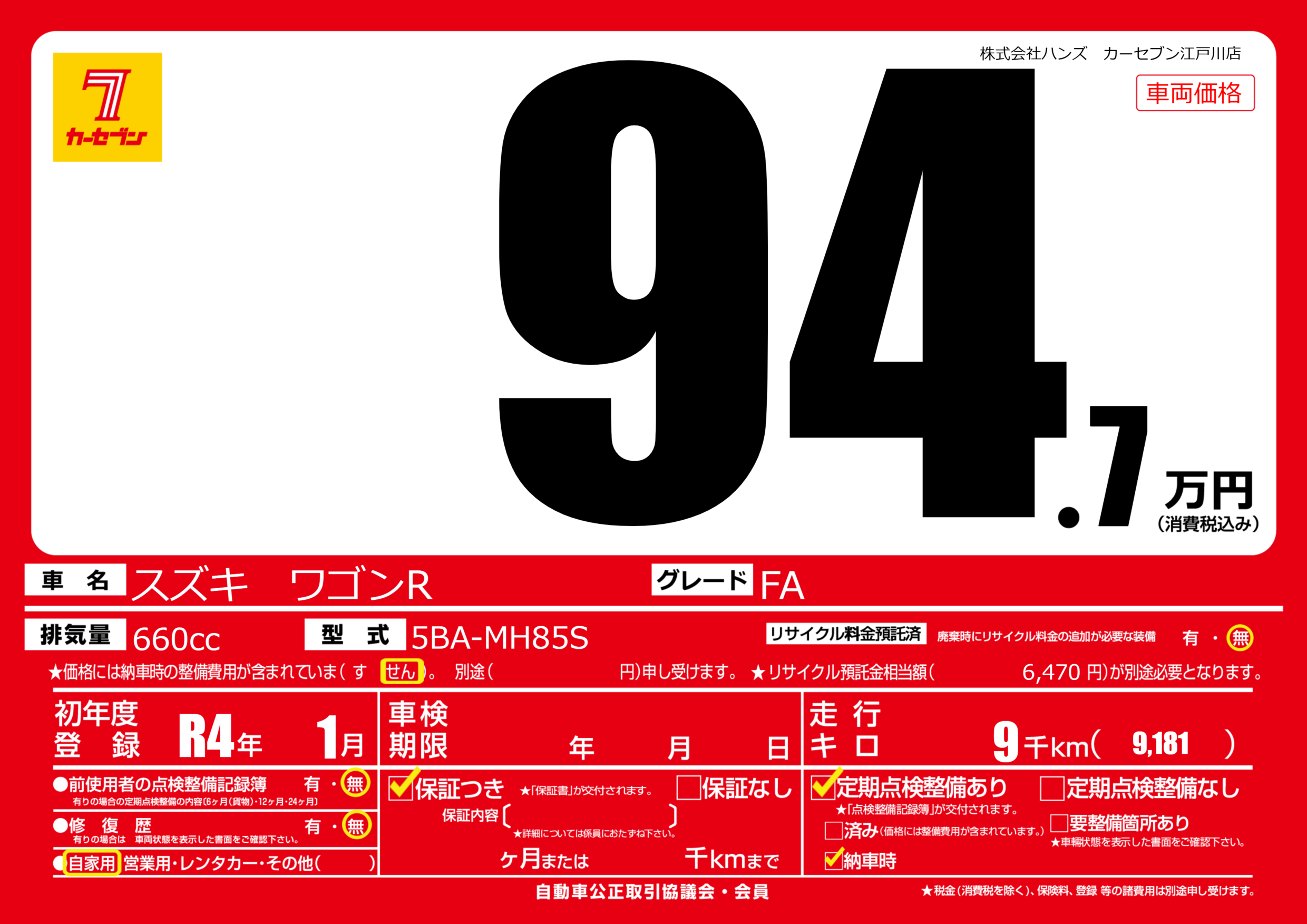 | 車名 | スズキ ワゴンR | グレード ミッション 排気量 |