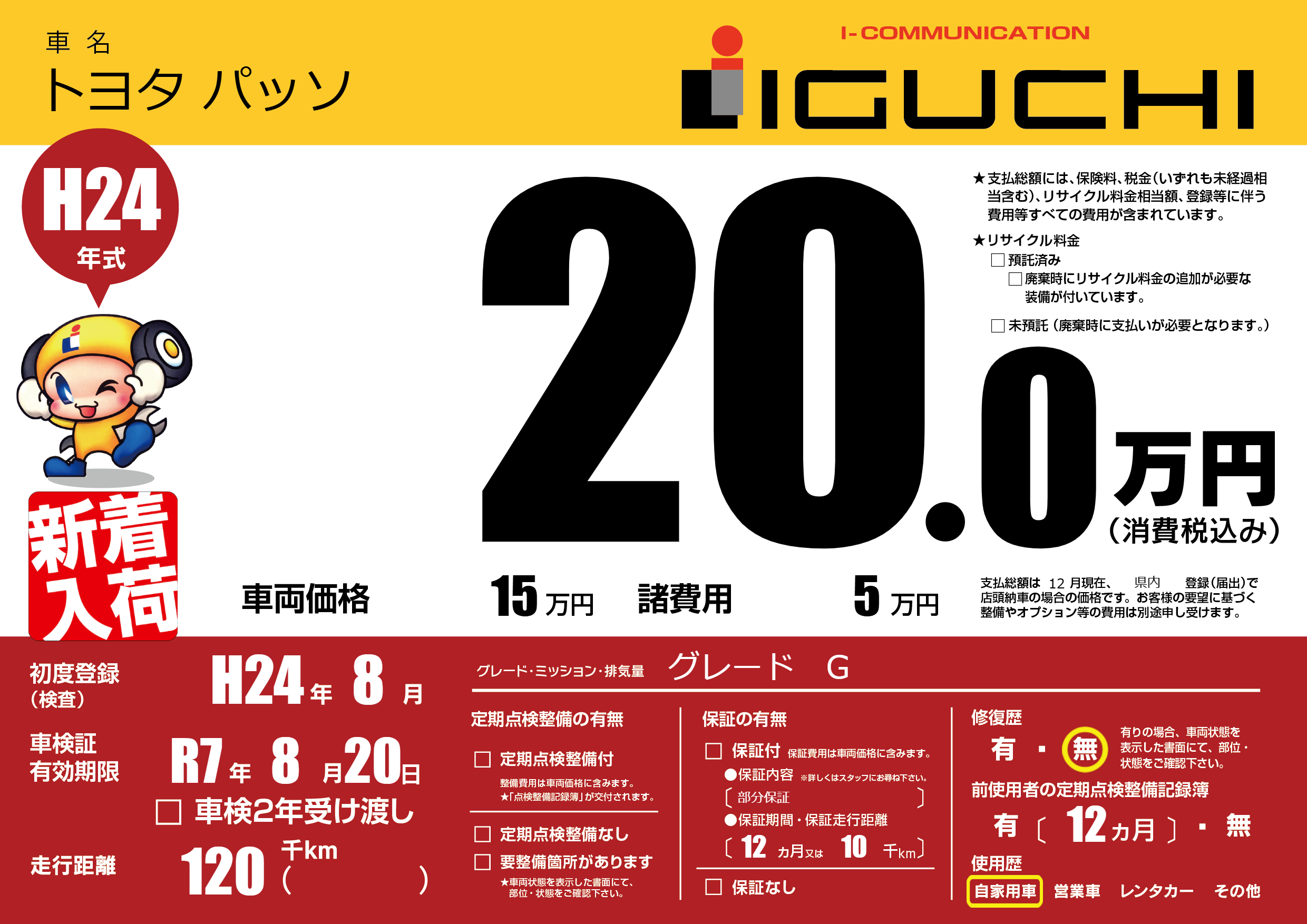 | 走行キロ | 12万km | 初年度登録 | H24年8月 |