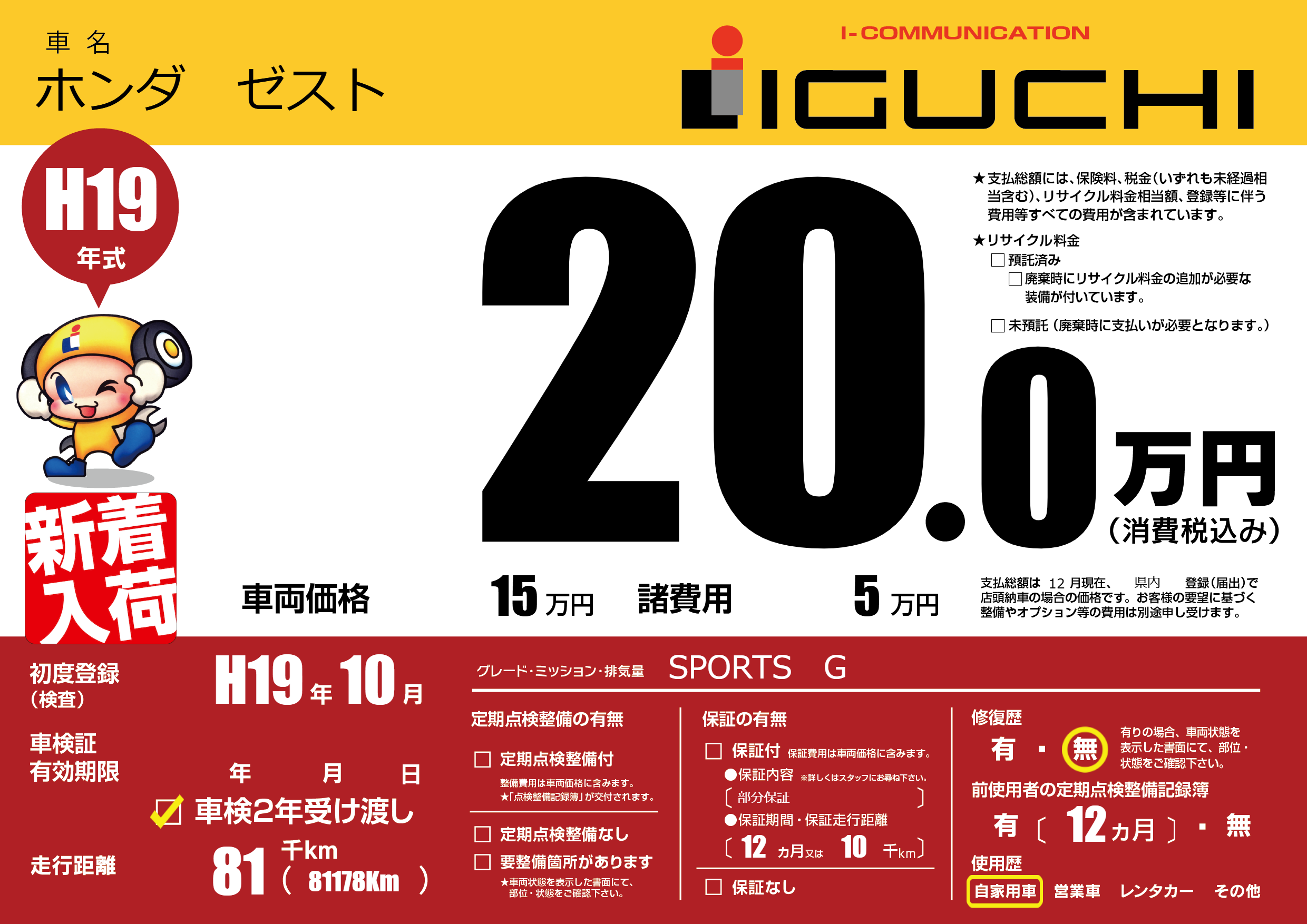 | 車名 | ホンダ ゼスト | グレード ミッション 排気量 |