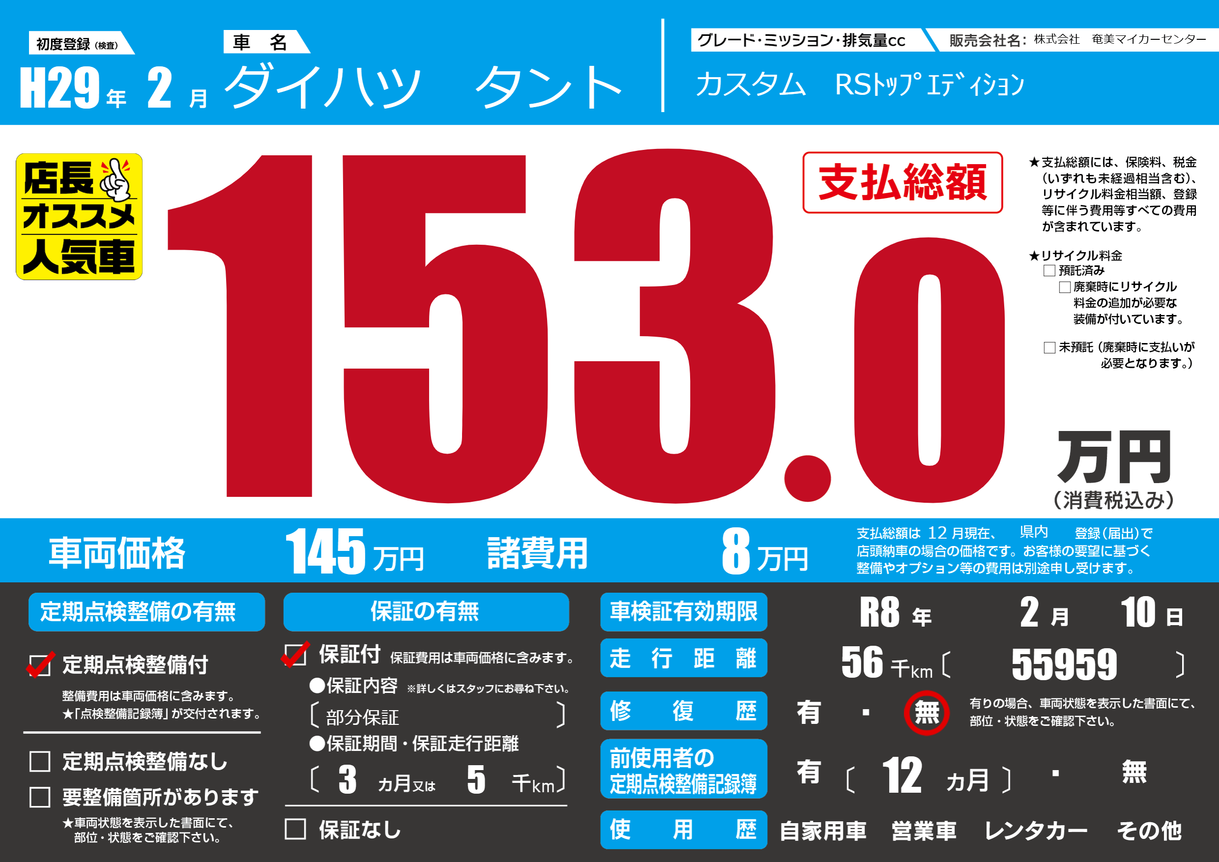 | 車名 | ダイハツ タント | グレード ミッション 排気量 |
