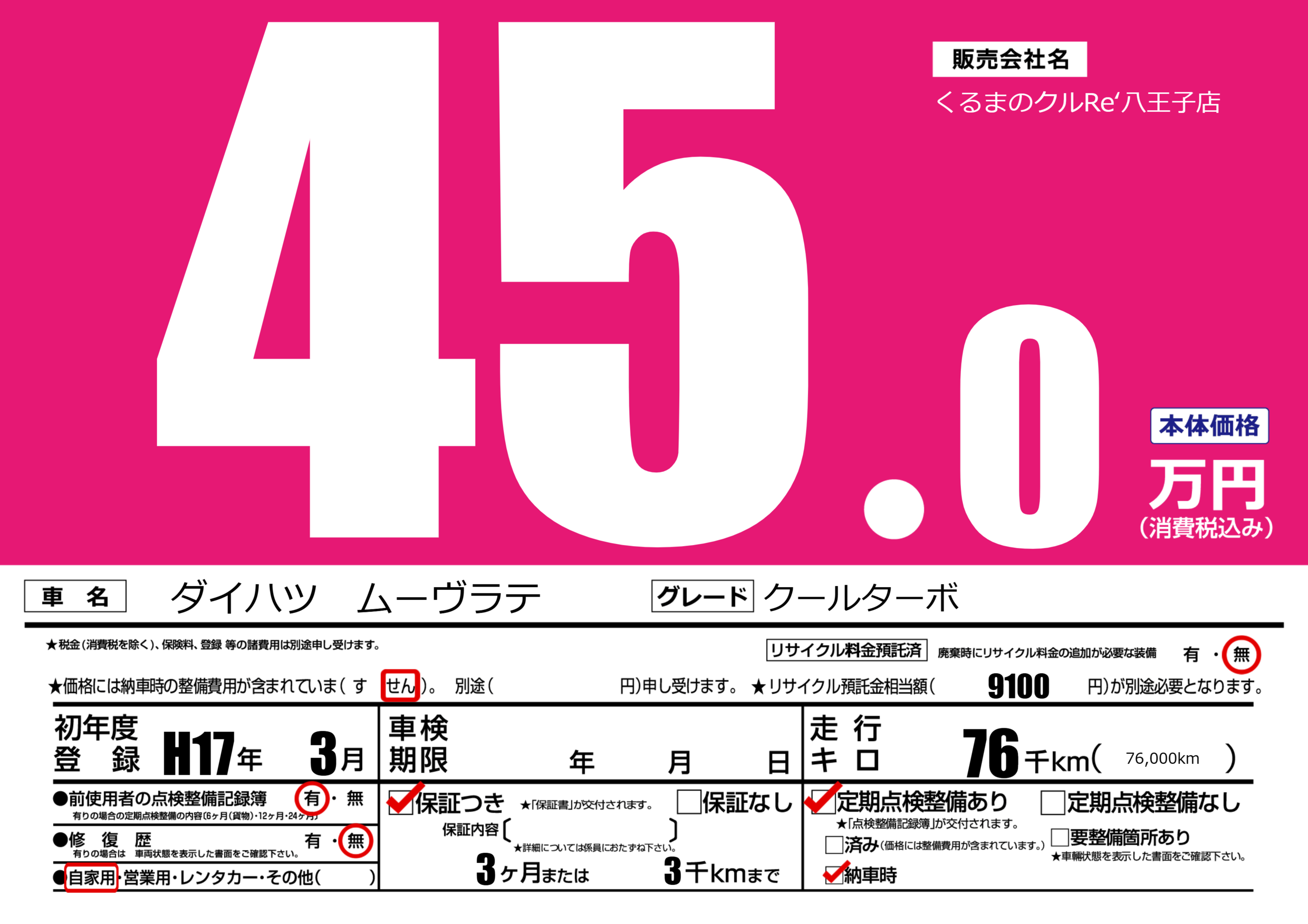 なし | リサイクル預託金相当額 | ( 9100円)が別途必要 |