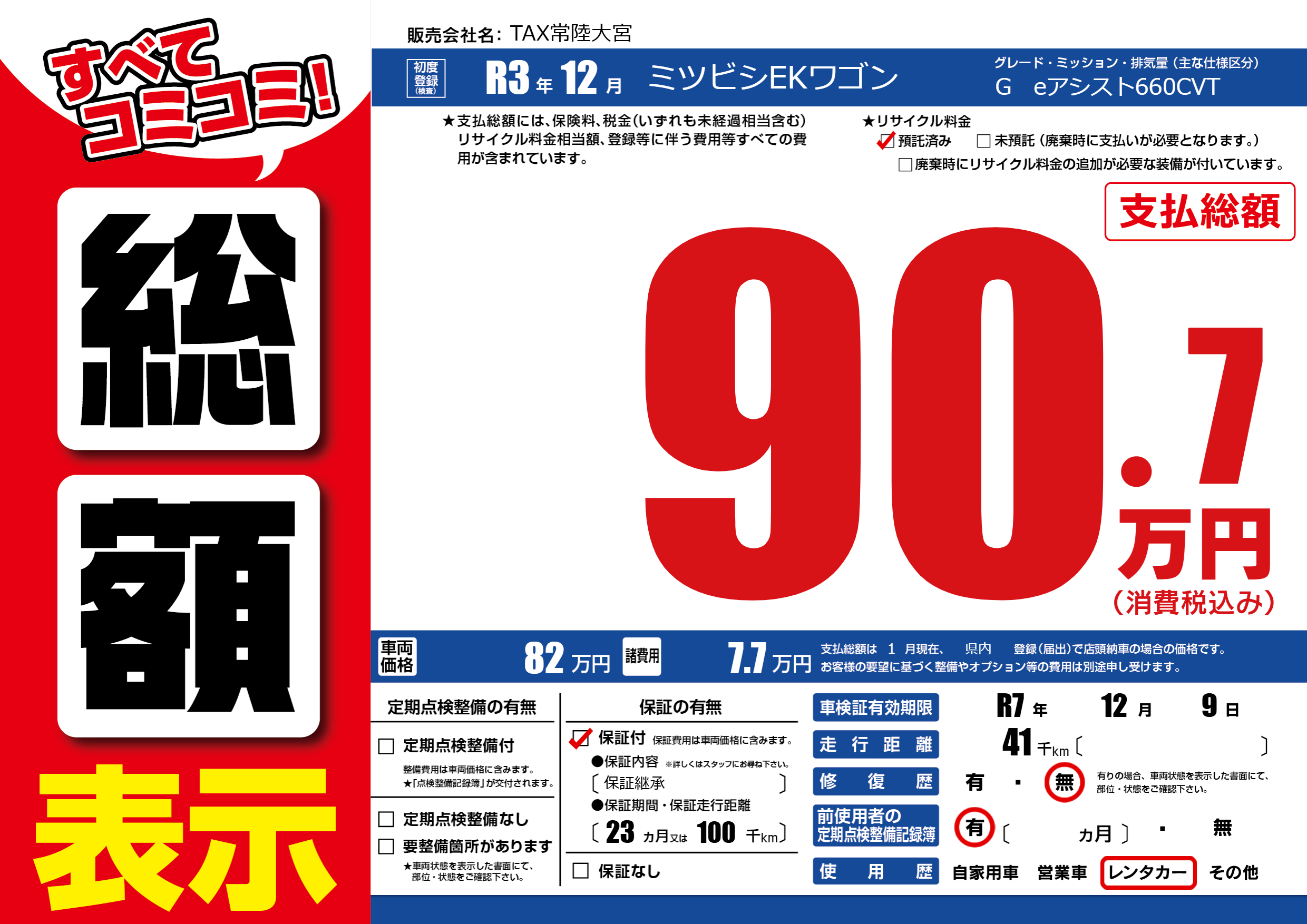 | 車名 | ミツビシEKワゴン | グレード ミッション 排気量 |