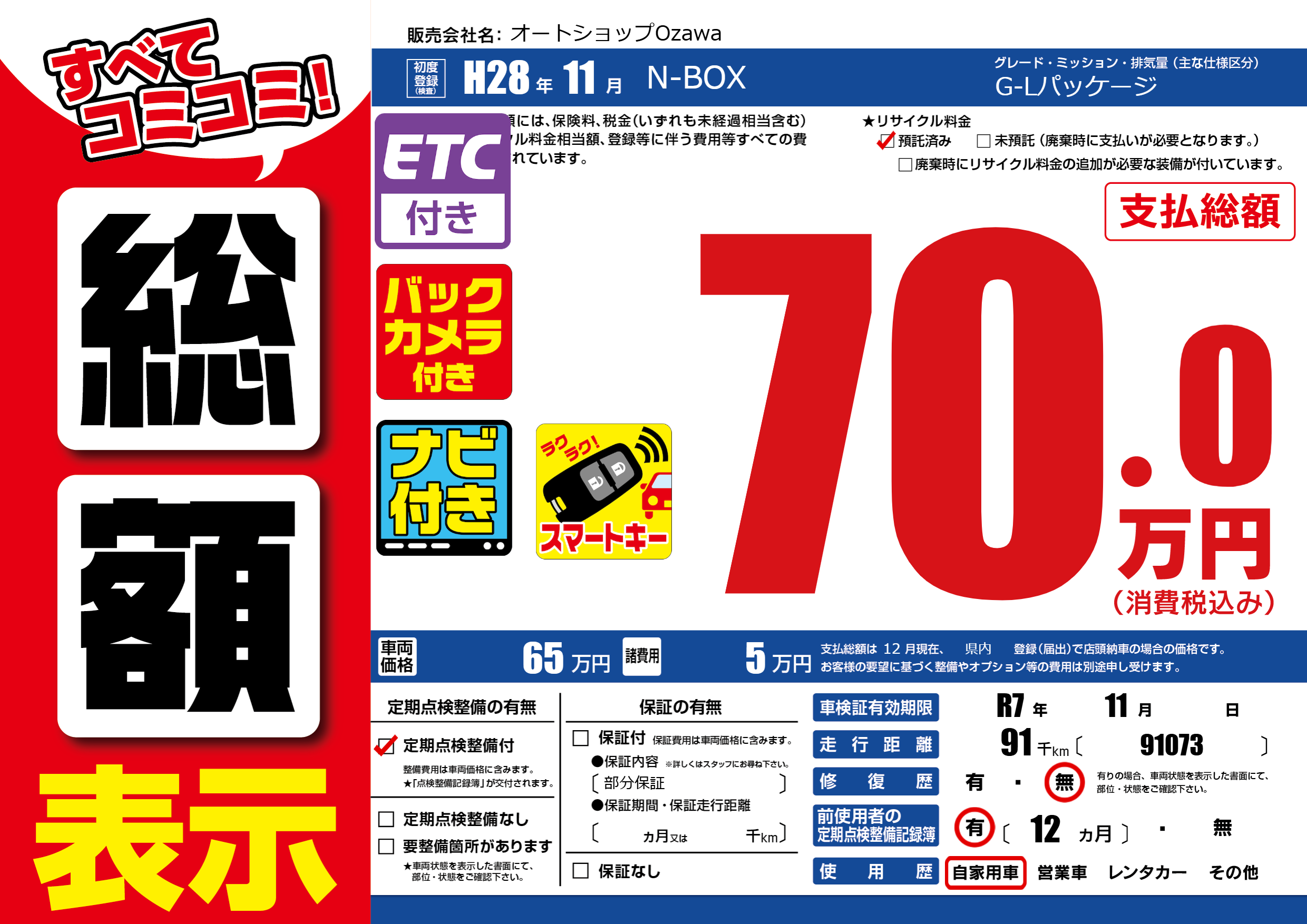 | 走行キロ | 9.1万km | 初年度登録 | H28年11月 |