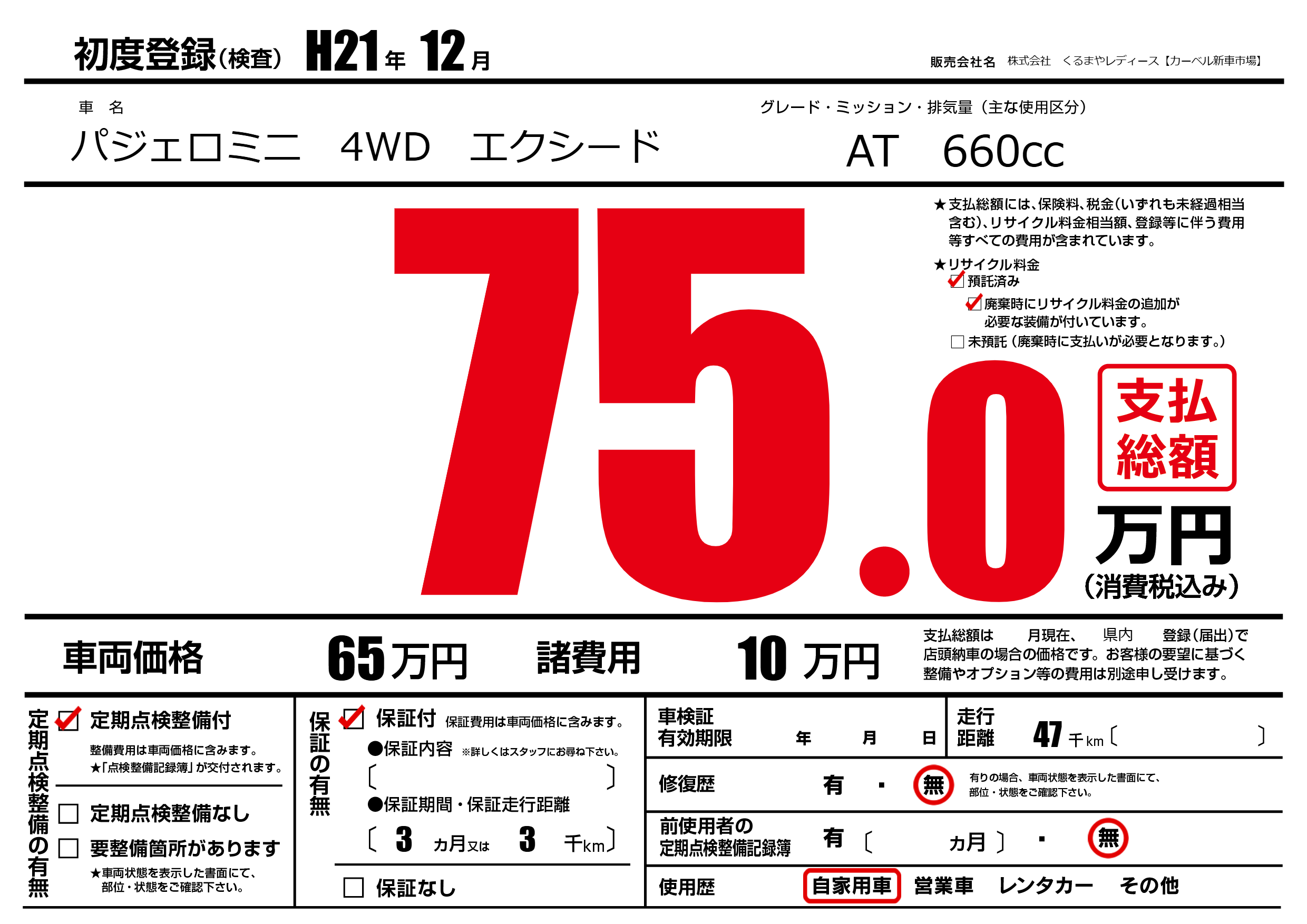 | 車名 | パジェロミニ 4WD エクシード | グレード ミッション 排気量 |