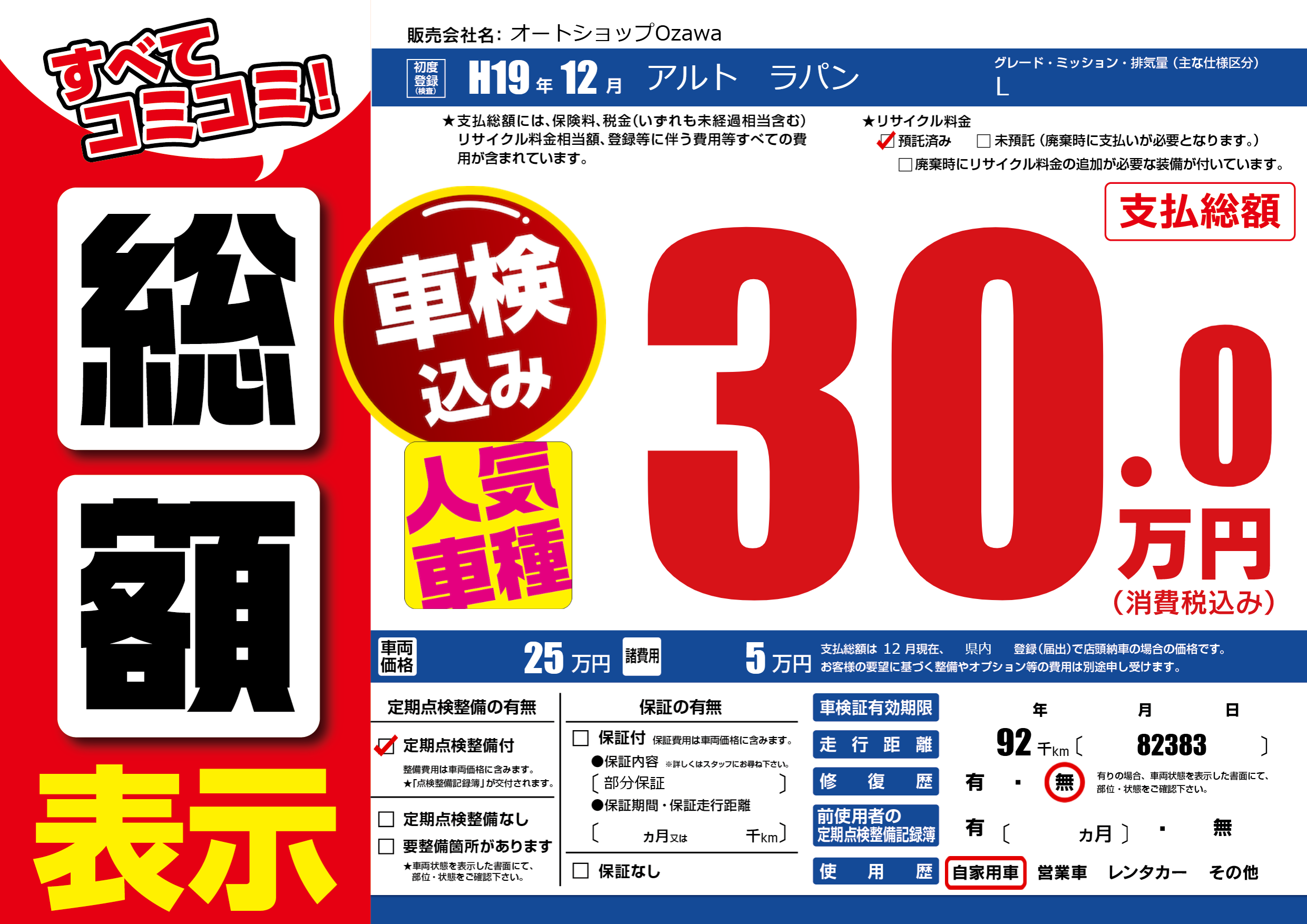 | 走行キロ | 9.2万km | 初年度登録 | H19年12月 |